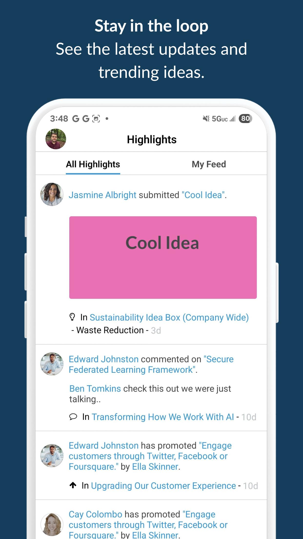 ด้วย Ideas by Brightidea คุณจะได้รับการแจ้งเตือนทันทีเมื่อ บริษัท ของคุณมีปัญหาหรือหัวข้อที่ต้องการมุมมองและความคิดเห็นของคุณ เก็บความคิดข้อมูลเชิงลึกและแรงบันดาลใจของคุณในทุกที่ที่คุณอยู่ รวมตัวอย่างวิดีโอและเสียงภาพถ่ายและแม้กระทั่งภาพร่าง รับแรงบันดาลใจในขณะที่คุณและเพื่อนร่วมงานของคุณร่วมมือกันเพื่อสร้างแนวคิดที่ดีที่สุด