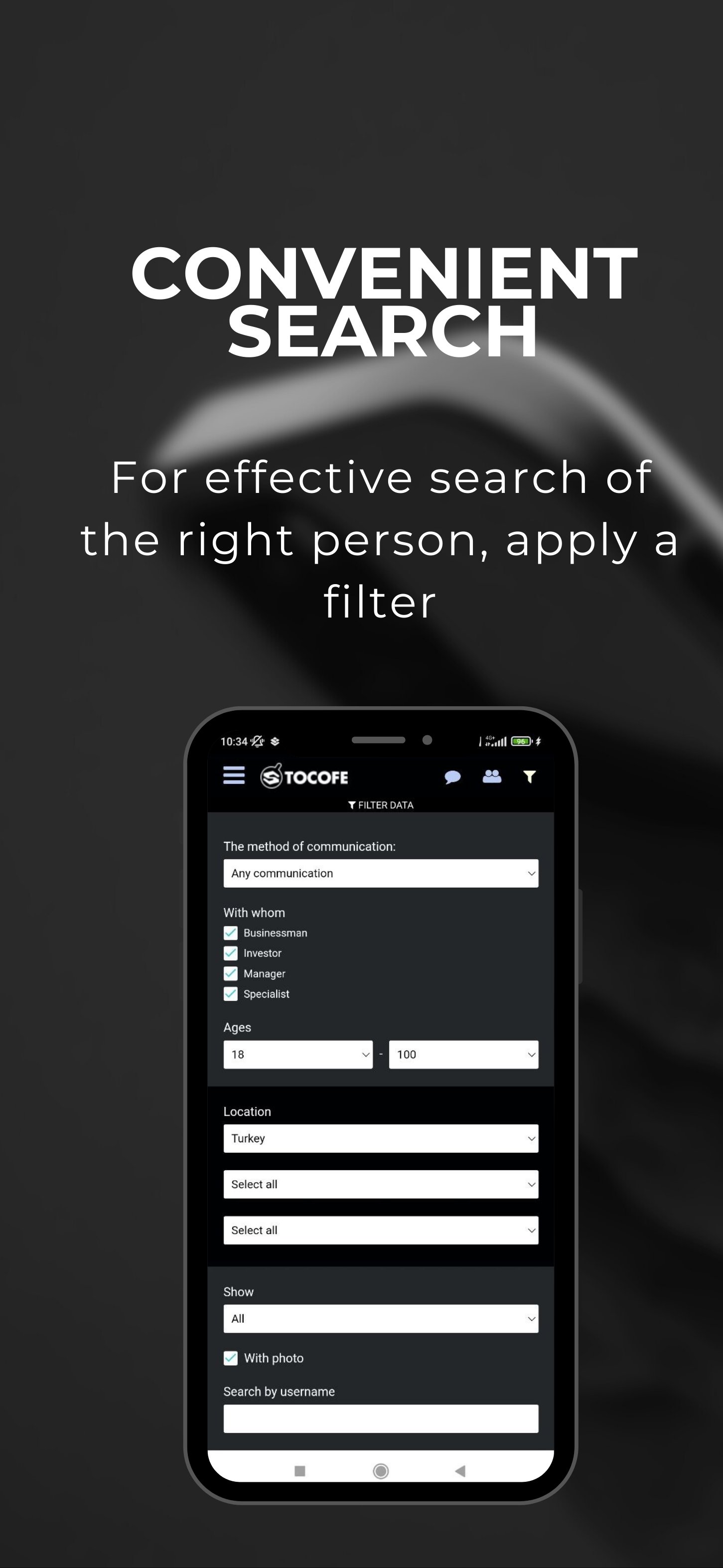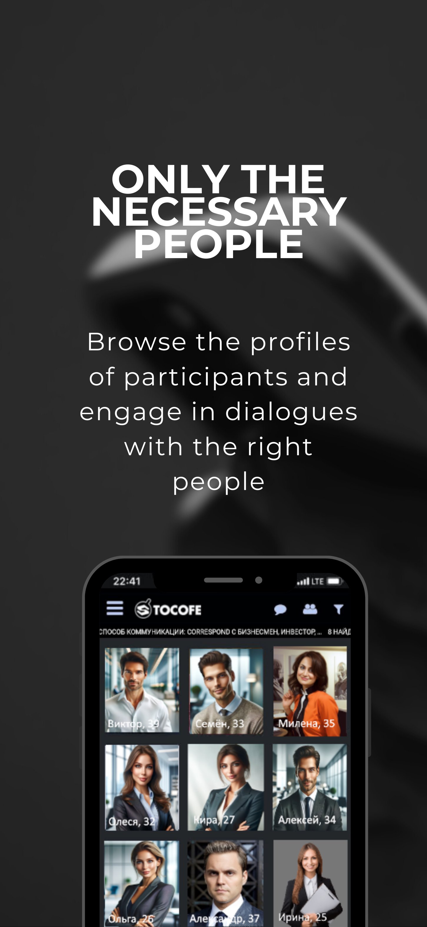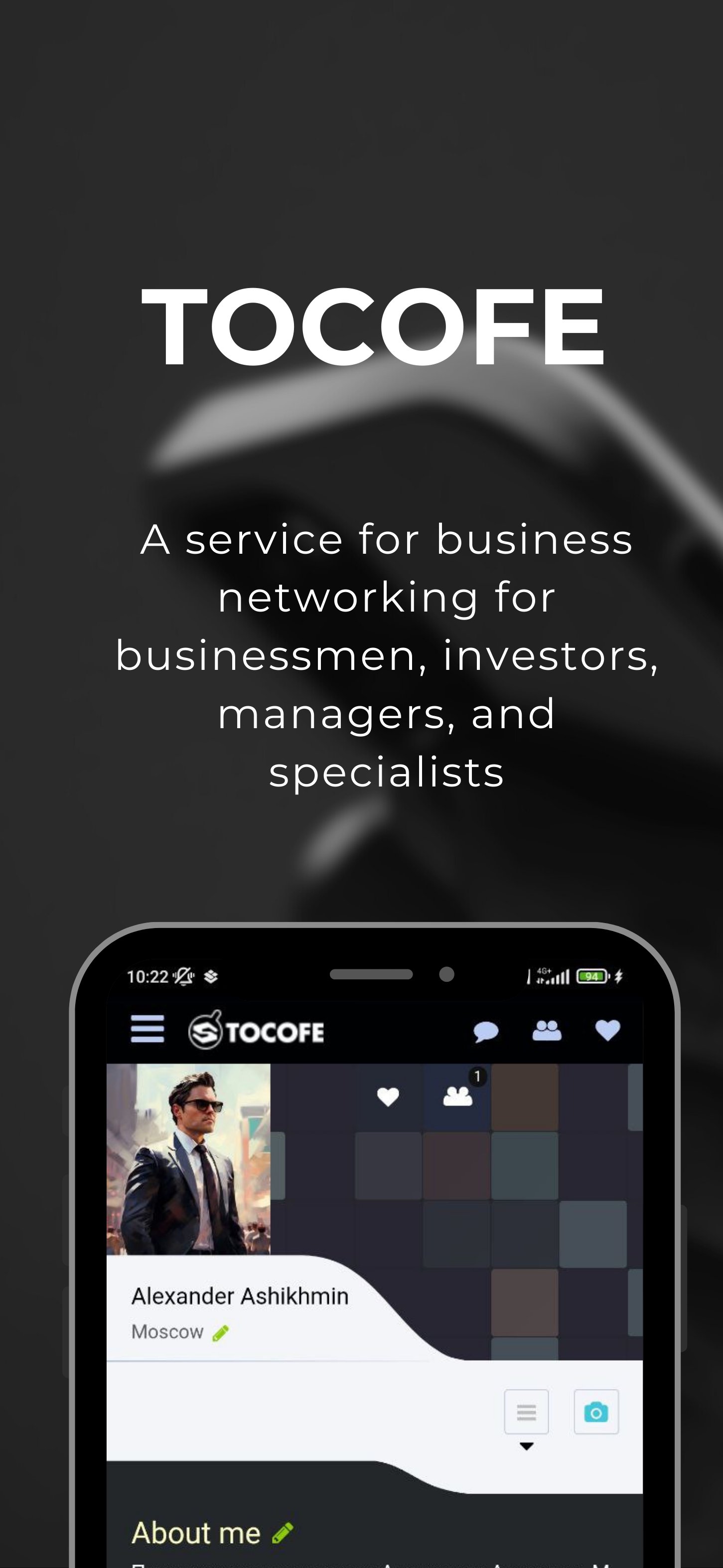 Tocofe คือโลกส่วนตัวของการหาคู่ทางธุรกิจในแอปพลิเคชันมือถือเพียงแอปเดียว ไม่ว่าคุณจะมีบทบาทใดในธุรกิจ ไม่ว่าจะเป็นนักธุรกิจ นักลงทุน ผู้จัดการ หรือผู้เชี่ยวชาญ เรามีทุกสิ่งที่คุณต้องการเพื่อค้นหาการติดต่อทางธุรกิจที่ประสบความสำเร็จ