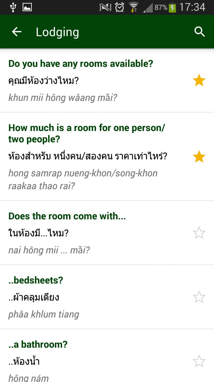Very useful Thai phrasebook, when you go to the Thailand or any other Thai speaking country! This phrasebook contains sentences from different categories, for example: