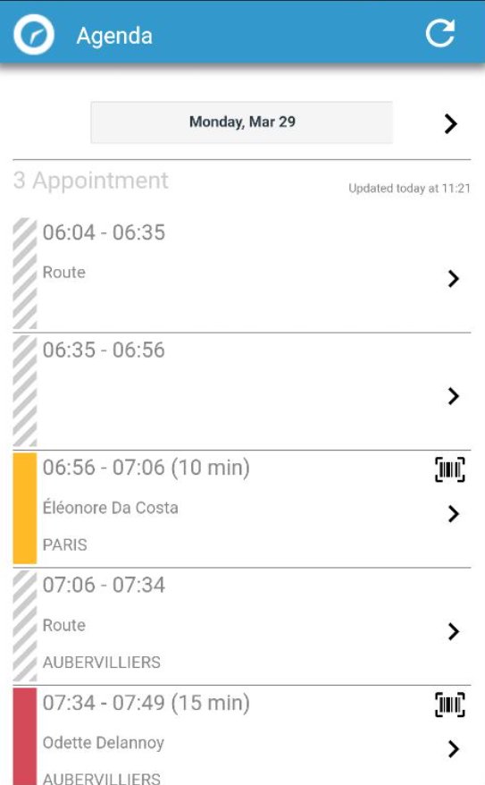 The Agenda page shows the visits to be carried out today and the next few days, within the limit configured by the person in charge of tour optimisation. Explore the dates to which you have access.