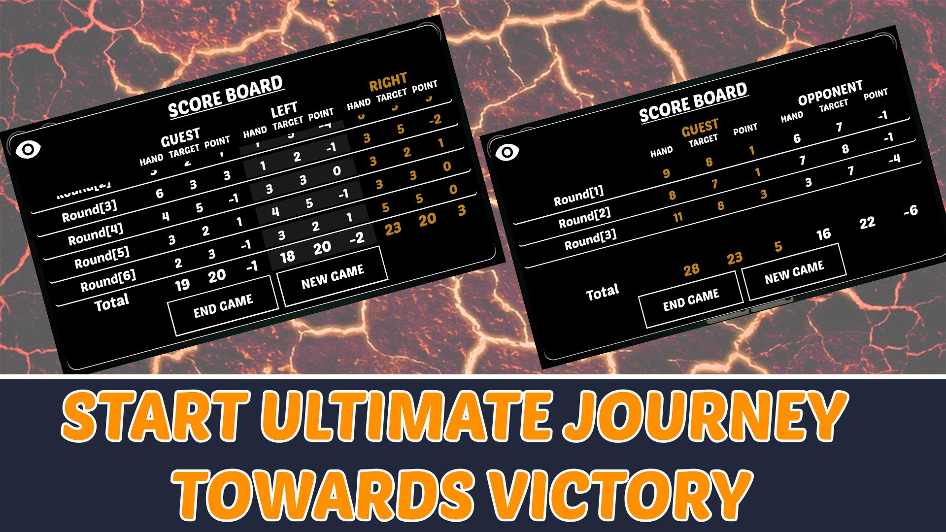 - After each round, hands will be calculated and after total rounds of play each player's total rounds hands will be added as a total hand and player with highest total hands will win.
