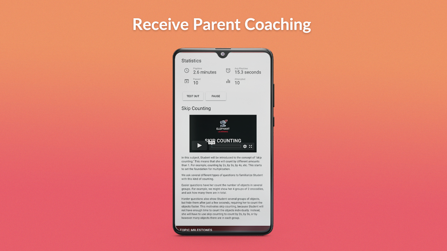 For the parent, our reports show you exactly what your students are working on, how we intend to teach it, where you may want to focus your attention, parent coaching videos for dealing with topics such as math anxiety, activities and games you can do to take learning outside of the system, and we even allow you to try puzzles as the student without affecting their score.