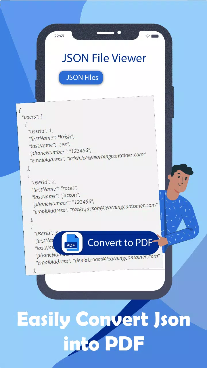 Json Dosya Açıcı - Json okuyucu, kullanıcının JSON dosyalarını biçimlendirmesine ve görselleştirmesine olanak tanır. Ücretsiz JSON görüntüleyici, kullanıcının JSON belgelerini biçimlendirmesine ve girintilenmesine izin verir. Android için JSON görüntüleyici, kullanıcının karmaşık JSON dosyalarına göz atmasını sağlar. JSON görüntüleyici ve düzenleyici dört ana özellikten oluşur; Json dosyaları, dosyaları seçin, yakın zamanda görüntülenen ve dönüştürülen pdf. JSON dosyaları özelliği, kullanıcının cihazda depolanan tüm JSON dosyalarını görüntülemesine olanak tanır.