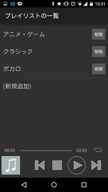 なお、ネットワークが切断されている等の理由でsamba共有上の音楽ファイルが参照できない場合、端末内に音楽ファイルがあれば、端末内の音楽ファイルをシャッフル再生します。