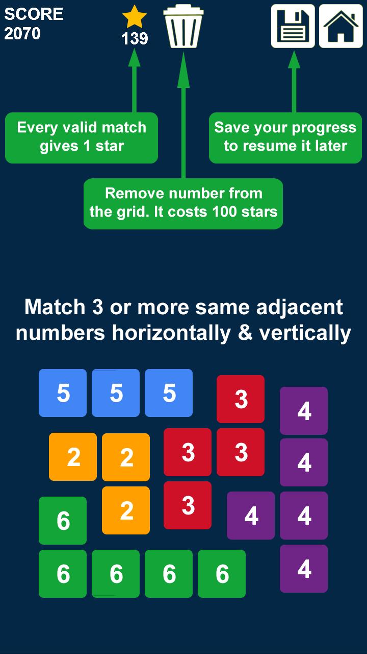 - 3 veya daha fazla aynı bitişik sayıyı yatay ve dikey olarak eşleştirin.