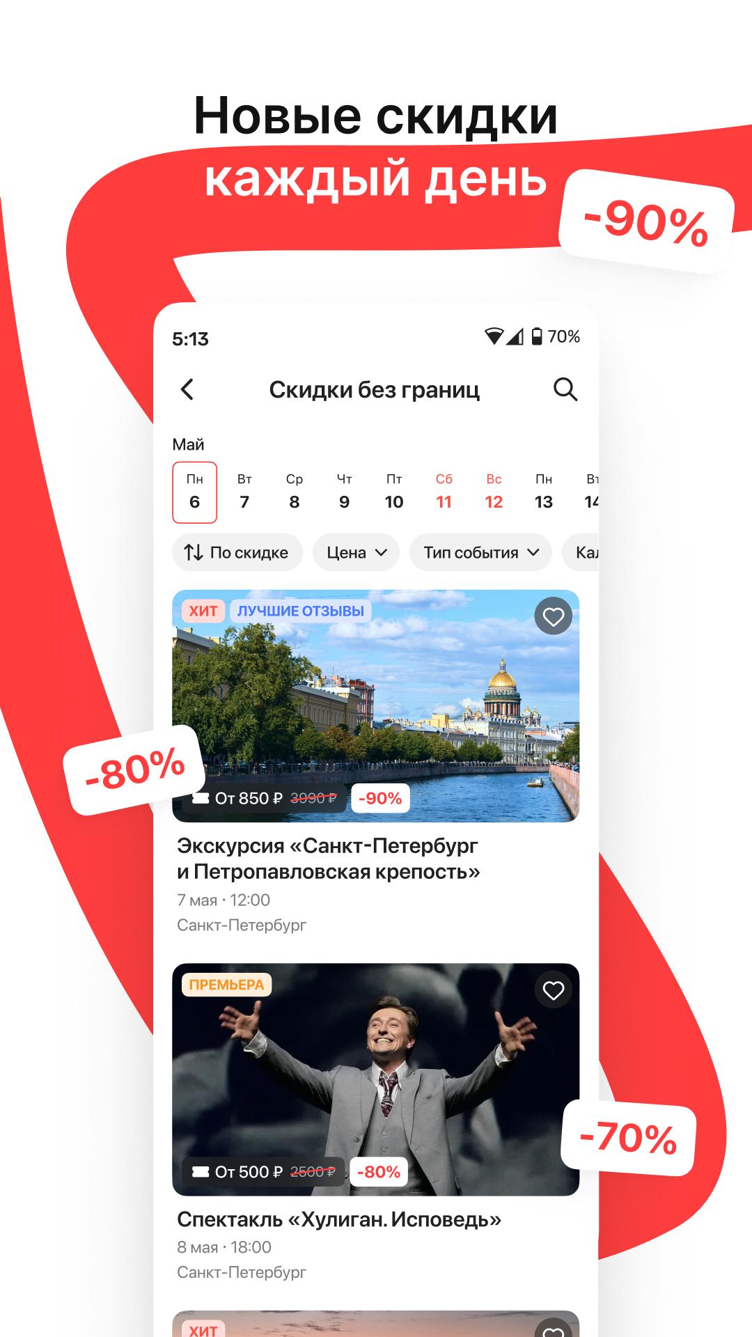 Теперь главный слайд встречает вас не только событиями, но и подборками мероприятий — находить интересное стало проще. Гарантируем лучшие цены в нашем приложении! Мы также обновили визуальные элементы и доработали тёмную тему.