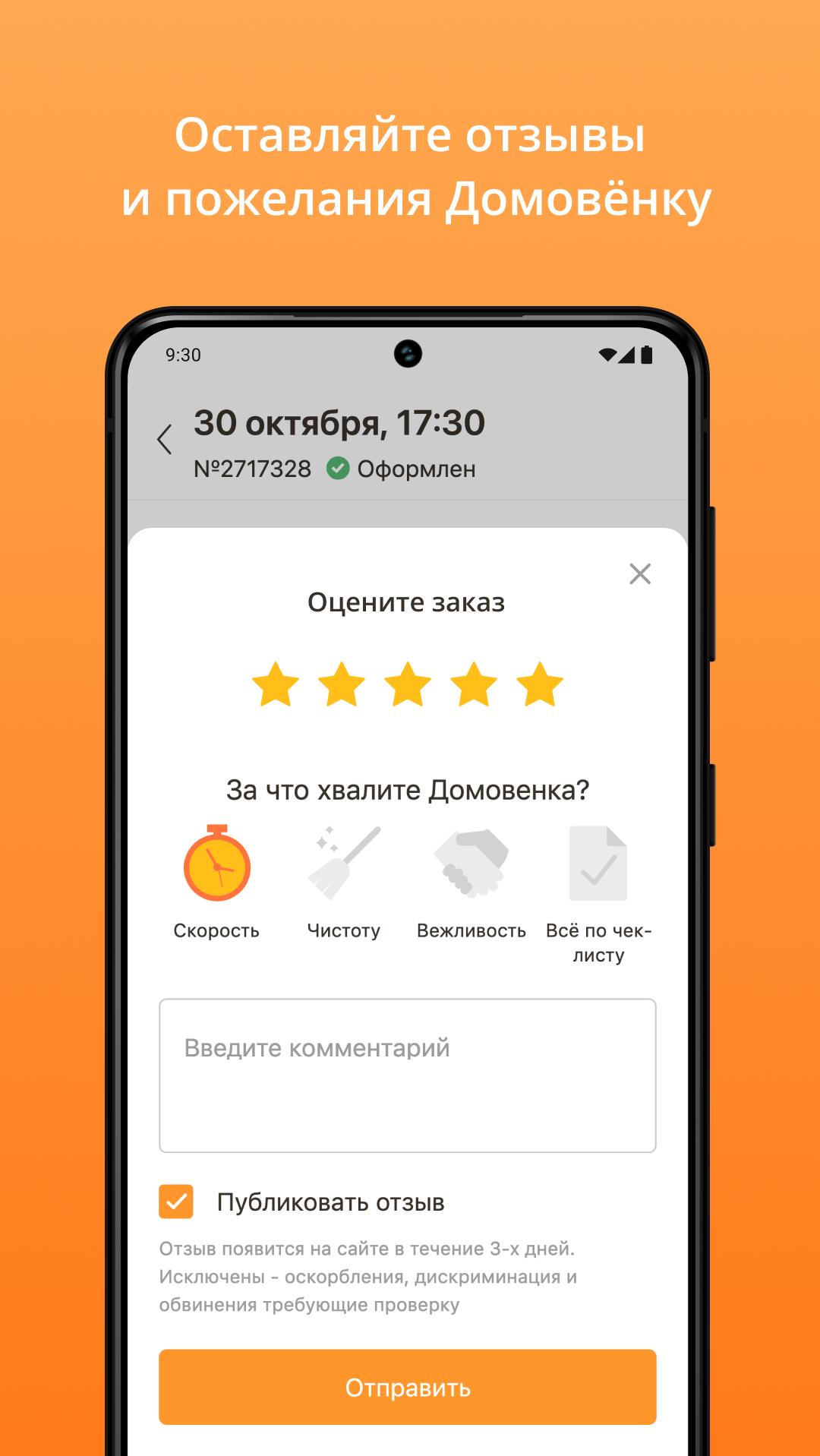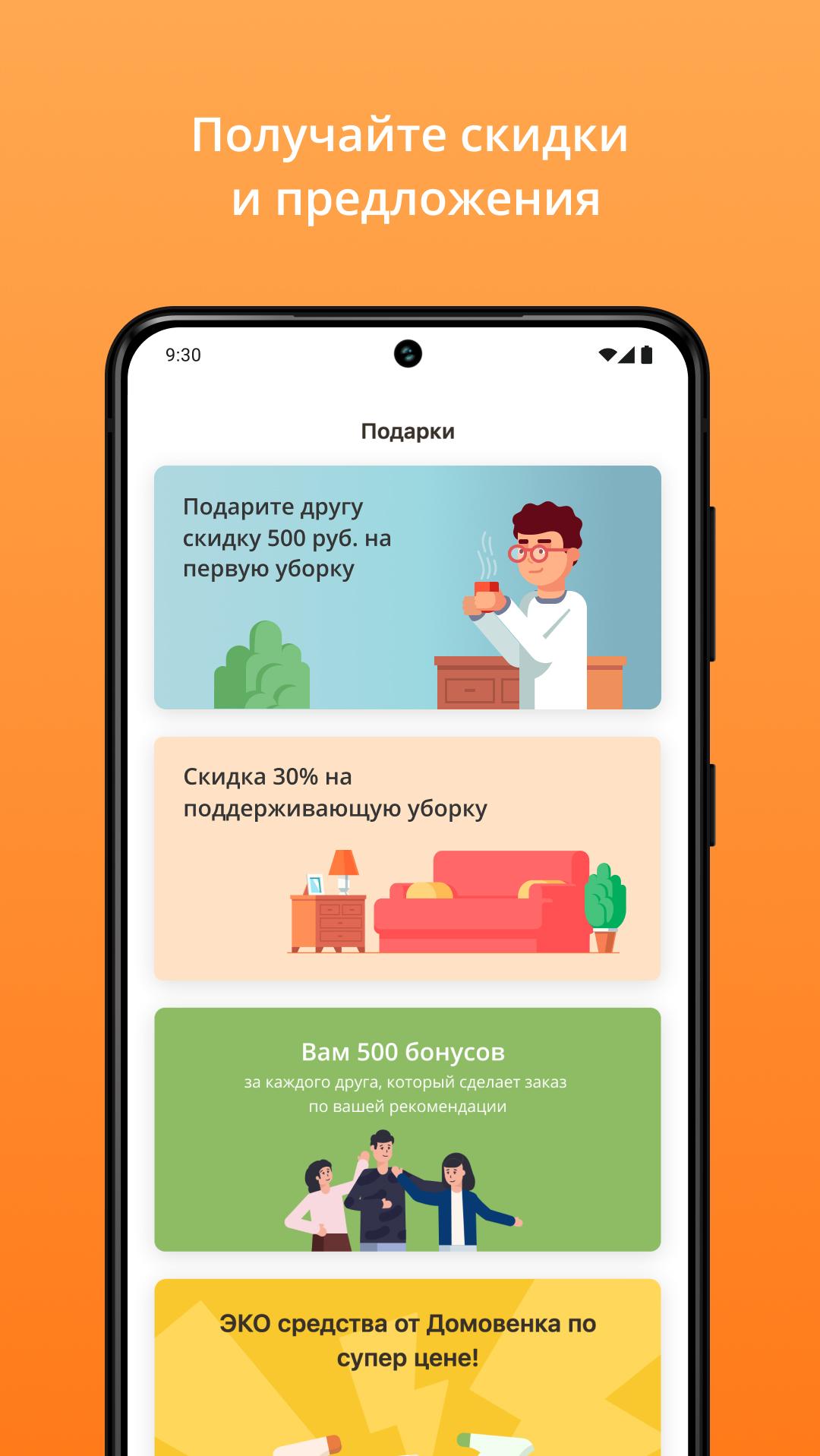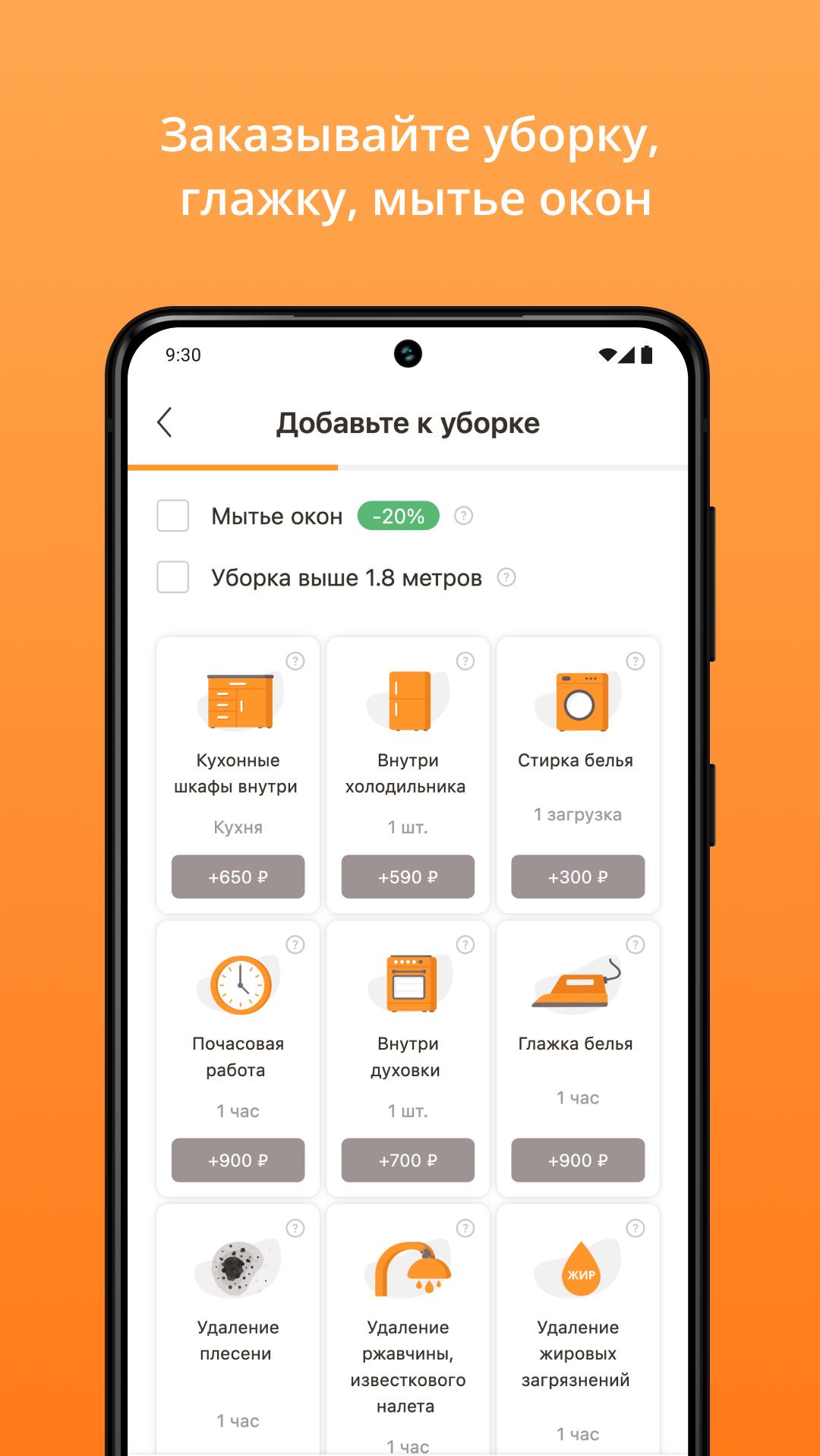 直接在應用程式中訂購莫斯科、聖彼得堡和下諾夫哥羅德的清潔服務!我們的清潔工將在方便的時間到達並恢復完美的秩序。