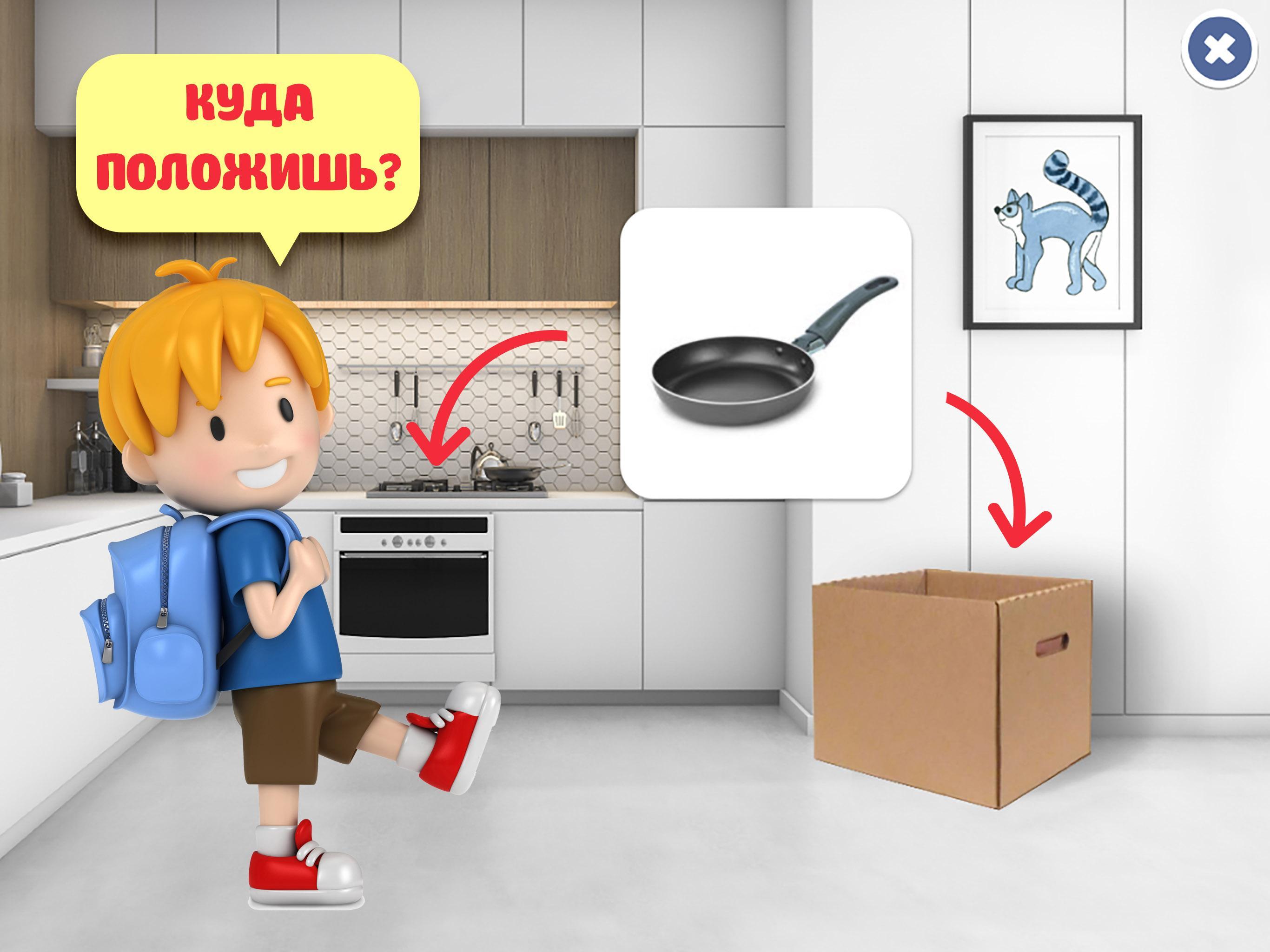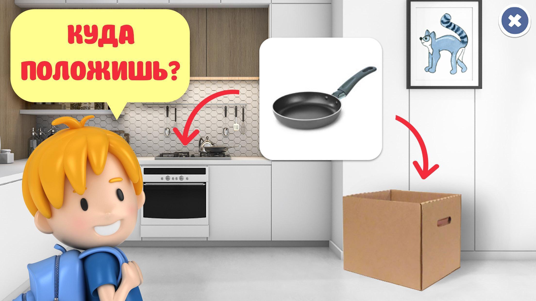 Для этого, мы поместили в группы предметов элементы из других категорий и просим игрока сделать правильную сортировку – например, «Положи одежду в шкаф, а лишнее – в коробку!», акцентируя внимание на том, что «лишний» предмет НЕ принадлежит к данной группе. Отличное задание для развивашки.