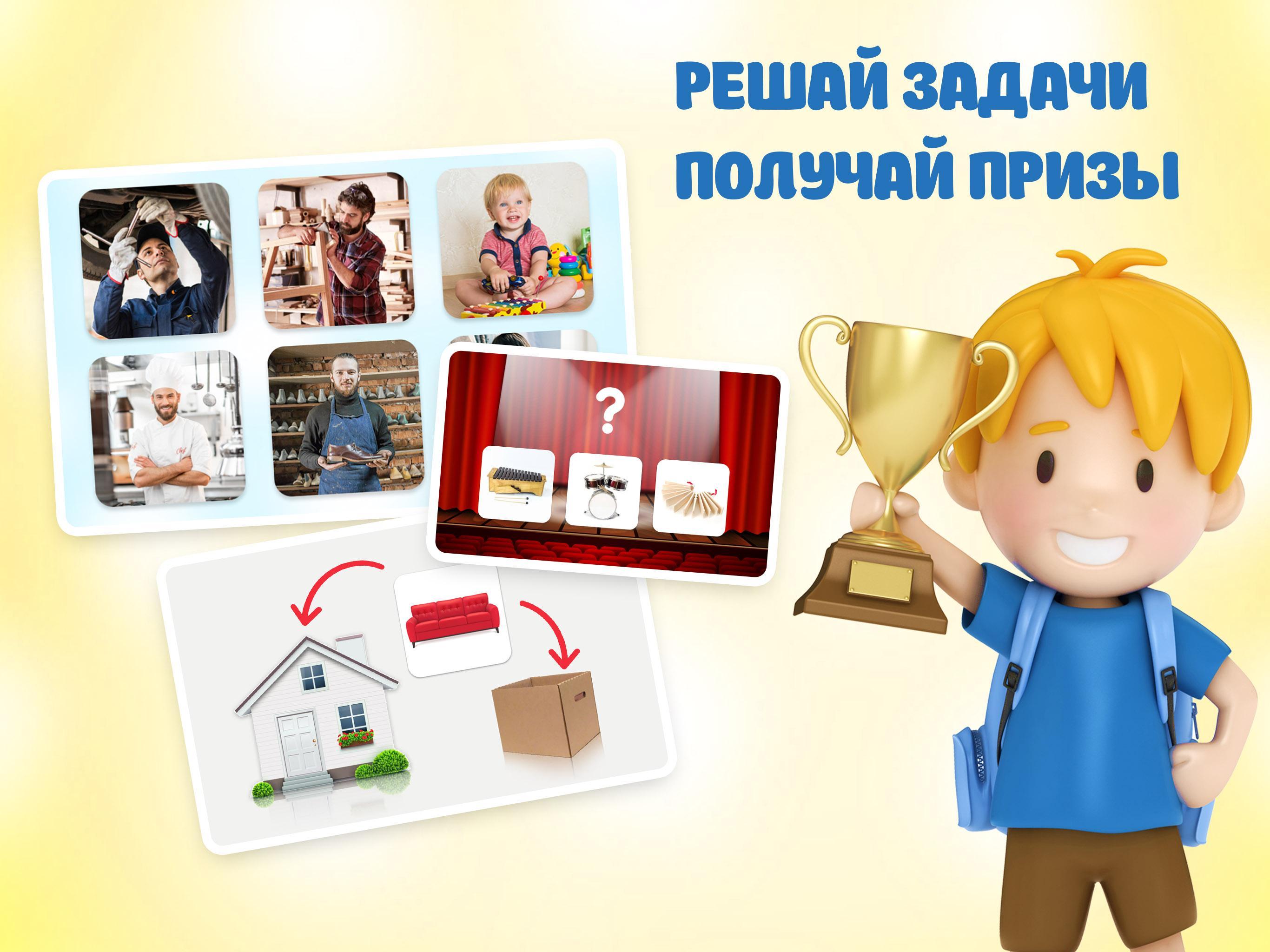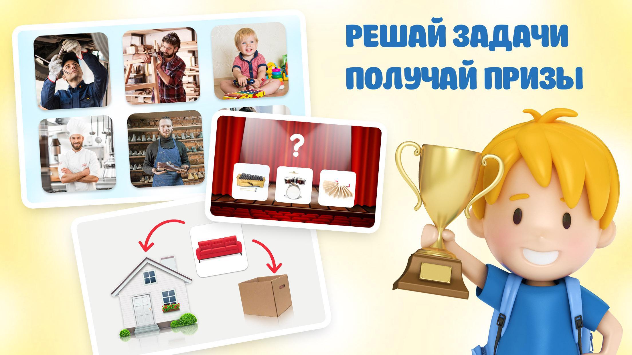- приложение знакомит играющих с профессиями и просит помочь мастерам (швея, мебельщик, сапожник, повар, механик) собрать объекты, с которыми они связаны в своей работе.