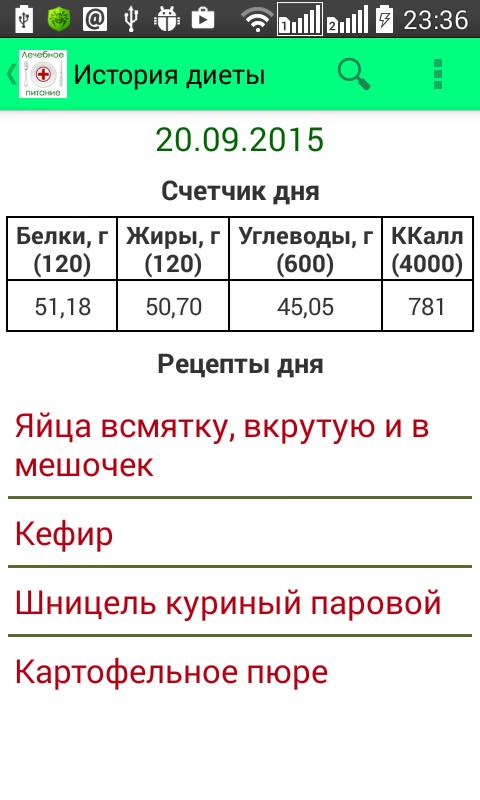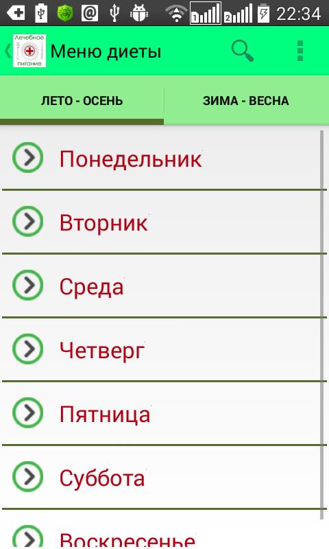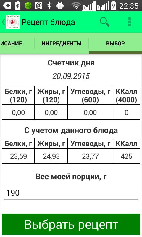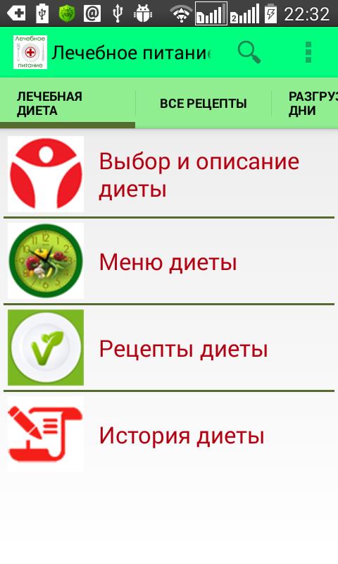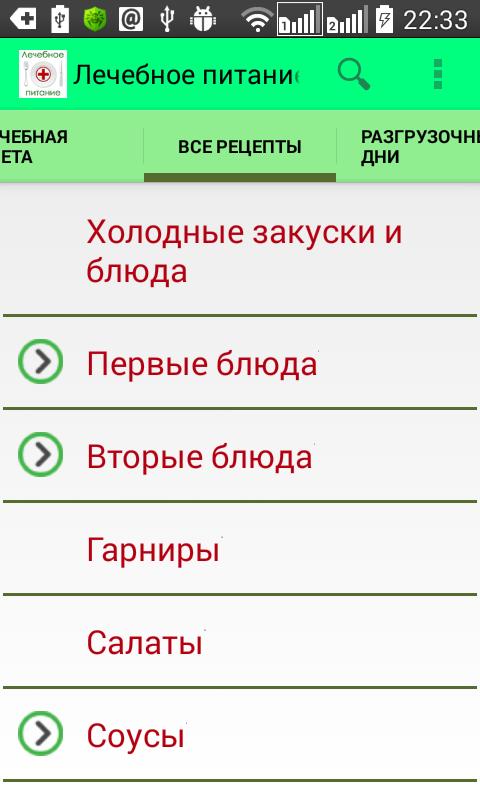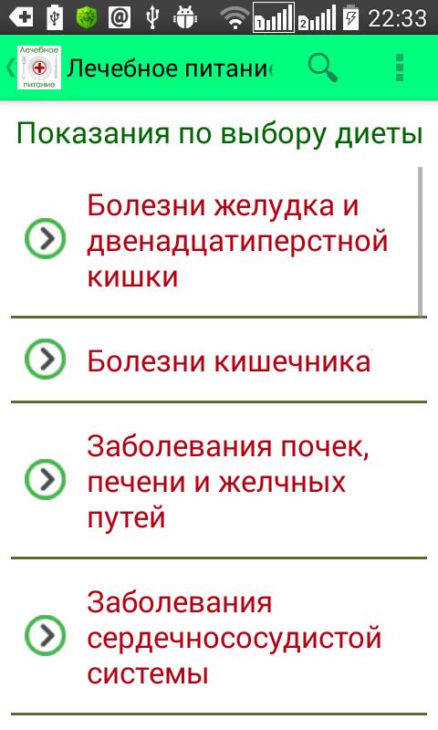 Приложение «Лечебное питание» является справочником лечебных диет, выбираемых в соответствии с заболеванием. Для каждой диеты формируется рекомендованное меню, позволяющее организовать правильное питание при различных заболеваниях. Встроен дневной калькулятор калорий, белков, жиров и углеводов в соответствии с выбранной диетой.