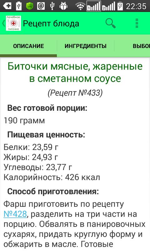 В справочнике «Лечебное питание» Вы не найдете пошаговых рецептов с бесполезными фотографиями. При составлении перечня блюд и описании рецептов подразумевалось наличие у пользователя приложения определенного кулинарного опыта.