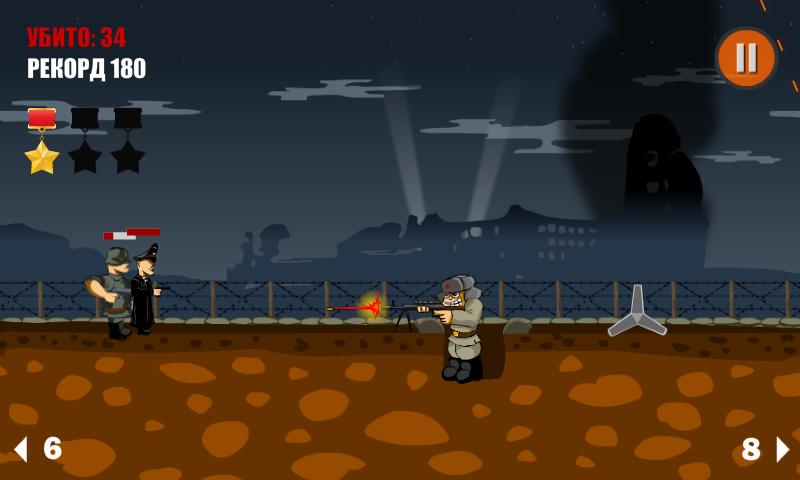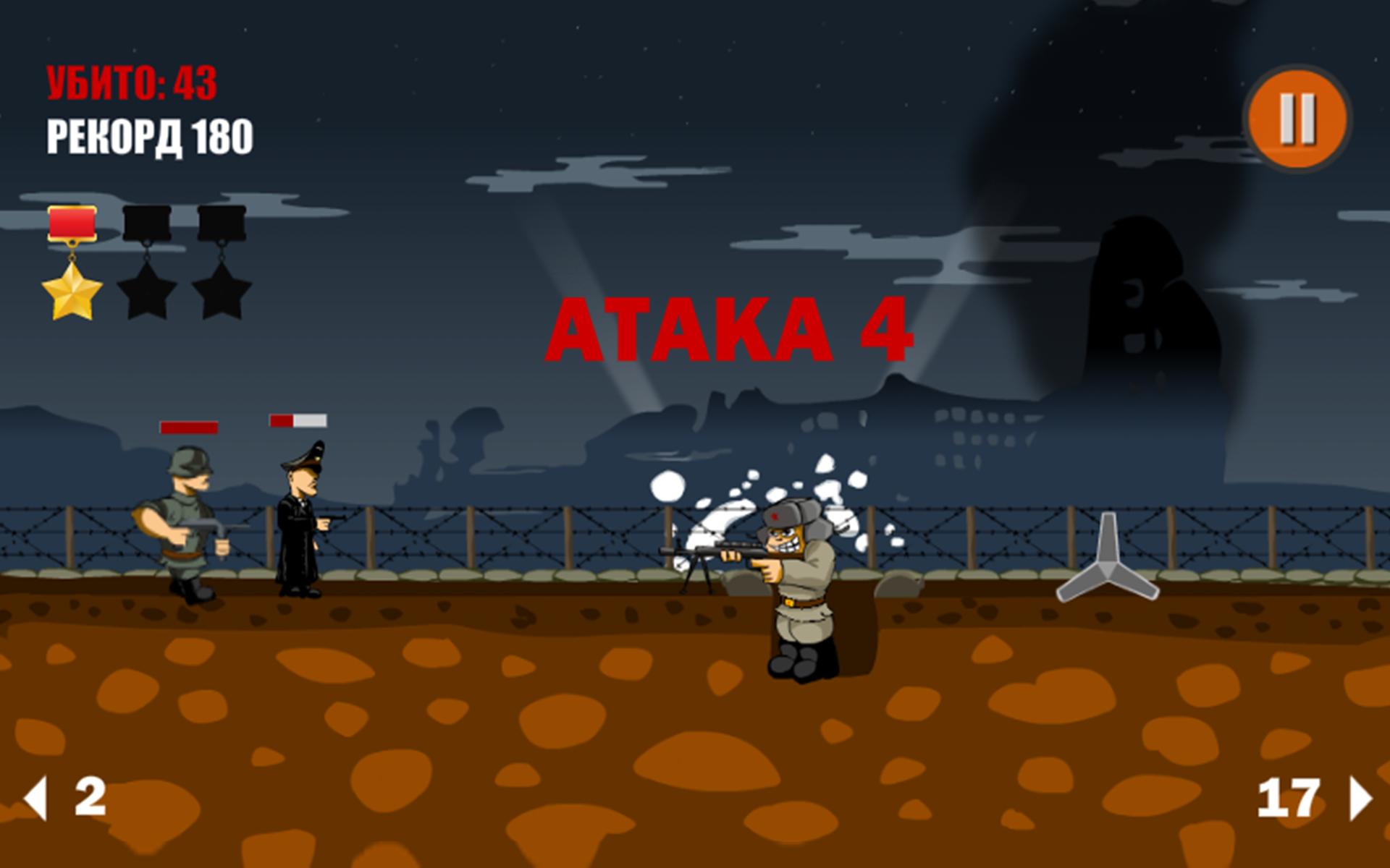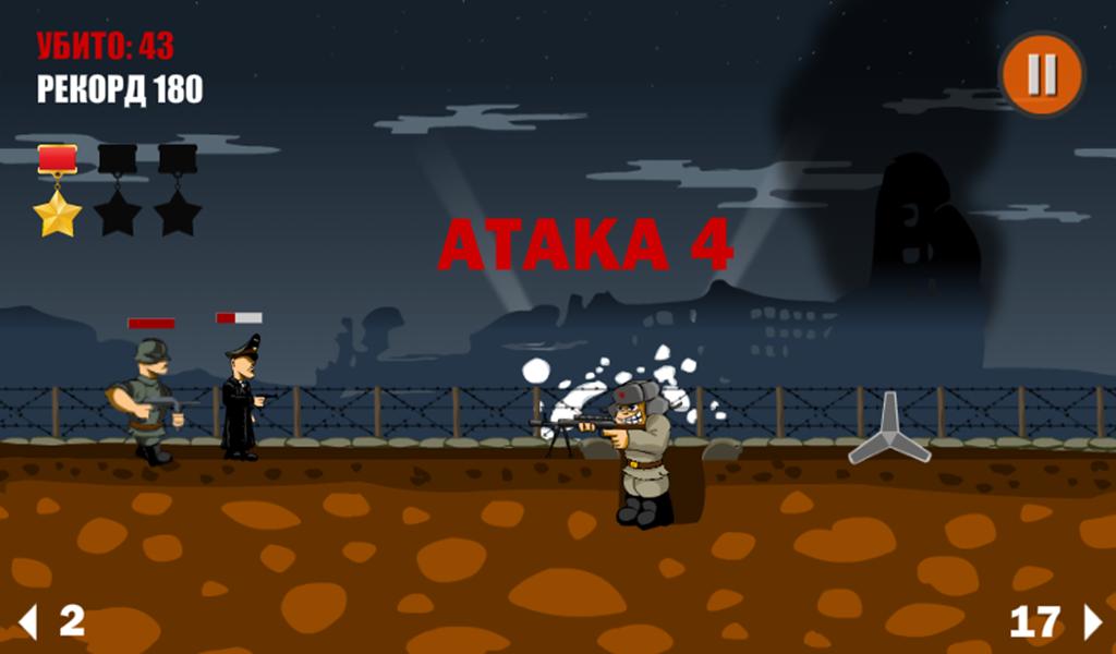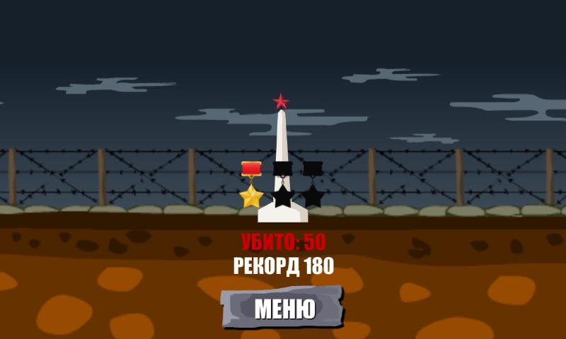 1942 год. Приказ "Ни шагу назад". Солдат Красной армии попадает в окружение. Выхода нет. Он принимает бой и до последней капли крови сдерживает постоянно нарастающие атаки врага. Сколько он продержится, зависит от вас. Поливайте смертельным, пулеметным огнем врага и заслужите три звезды героя Советского Союза.