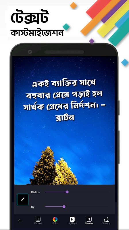 লিপিয়ন:ছবিতেলিখনদিয়েযেকোনোছবিকেক্রপকরা,রেশিওরেশিওকরেক্রপক্রপসুবিধা。。 ছবিতেলেখাজন্যভিতরেইদেওয়াআছেঅসংখ্য,বানীবানী。。。。 পছন্দ মতো Quote সিলেক্ট করে বসানো যাবে ছবিতে। ব্রাইটনেস, কন্ট্রাস্ট সেট করে এডজাস্ট করা যাব৬ অনেকগুলোফন্টপছন্দেরসিলেক্টকরেবাংলালেখা。。 লেখারপিছনেশ্যাডোযুক্তকরাযাবে,দেওয়াযাবে,টেক্সটটেক্সটকরা。。。。 হাইলাইটওস্পেসিংফিক্সকরানোযাবে। বিভিন্নওভারলেইফেক্টএডকরাযাবে। যুক্ত করা যাবে ইমোজি এবং এক্সট্রা ছবি। টাইপোগ্রাফিছবিছবিটিএবংইনস্টাগ্রামসহবিভিন্নশেয়ারঅনুযায়ীরেশিওসেটকরা。 টেক্সটবাকরাছবিতেছবিতে,এপ্লাইকরাযাবেকালার,শ্যাডোও。。。。 স্টাইলিশলিখারজন্যরয়েছেহাইকোয়ালিটিবাতনল রয়েছেসুন্দরট্রেন্ডিস্টিকারসমূহ। ব্রাশটুলব্যাবহারকরেছবিকেব্লারকরাযাবে।
