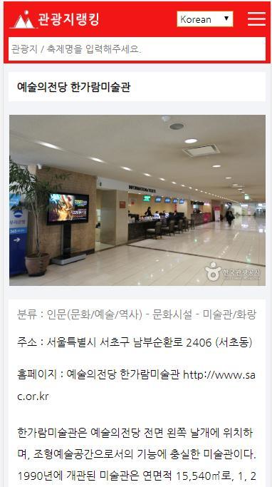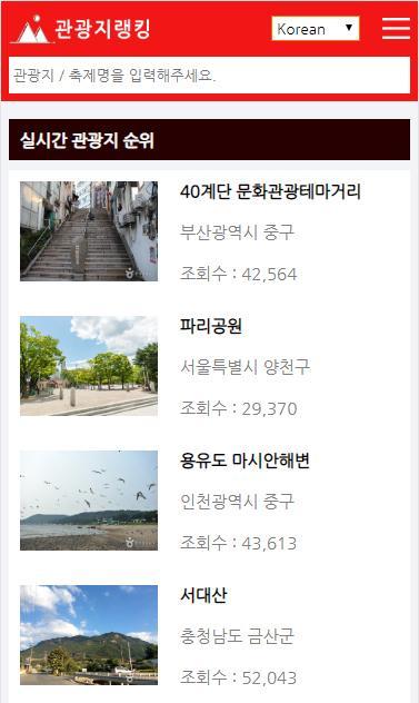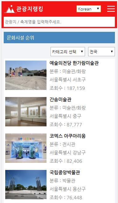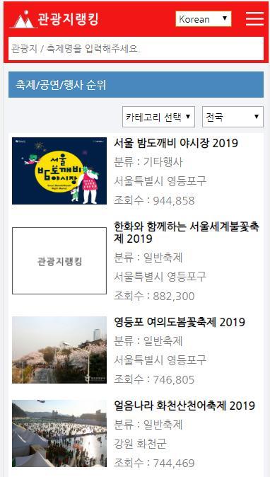 전국 관광지 / 문화시설 / 축제 / 공연 / 행사 / 숙박 / 음식점 / 쇼핑 정보 제공Last updated on 2020年01月02日