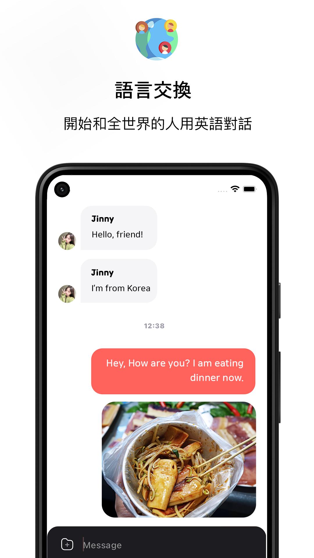 - 語言交換:與全球用戶進行英語實時對話,交外國朋友。