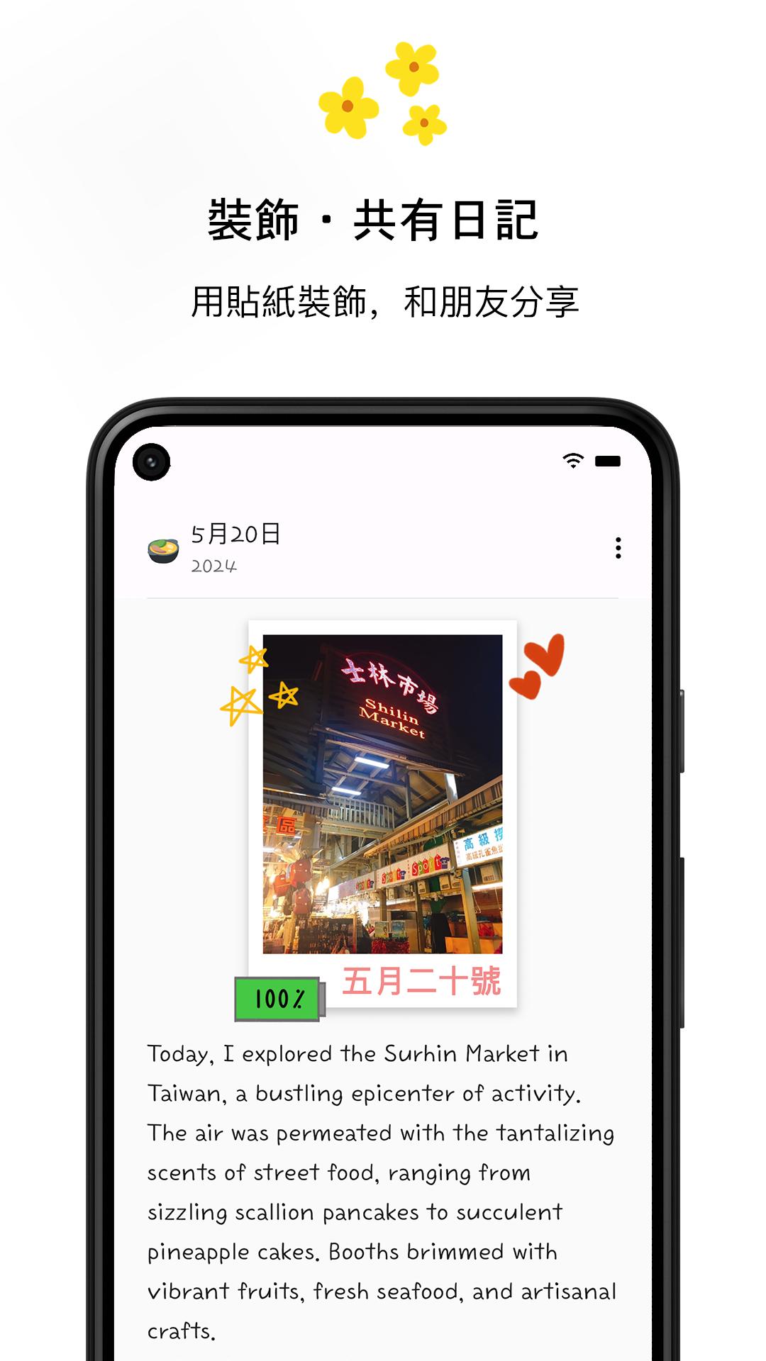 - 共享日記:用貼紙裝飾日記,與朋友和全世界分享