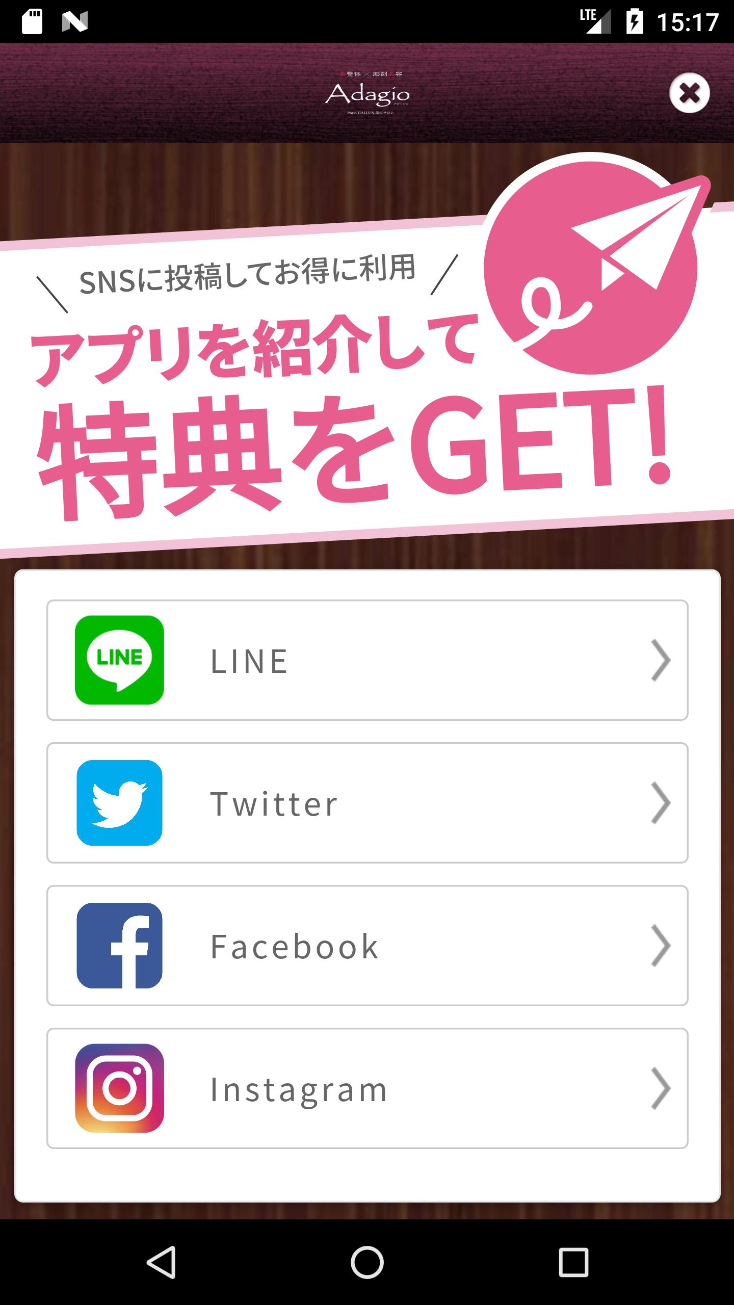 Adagio 美整体×彫刻美容のアプリをSNSを通じてお友達に紹介する事ができます。