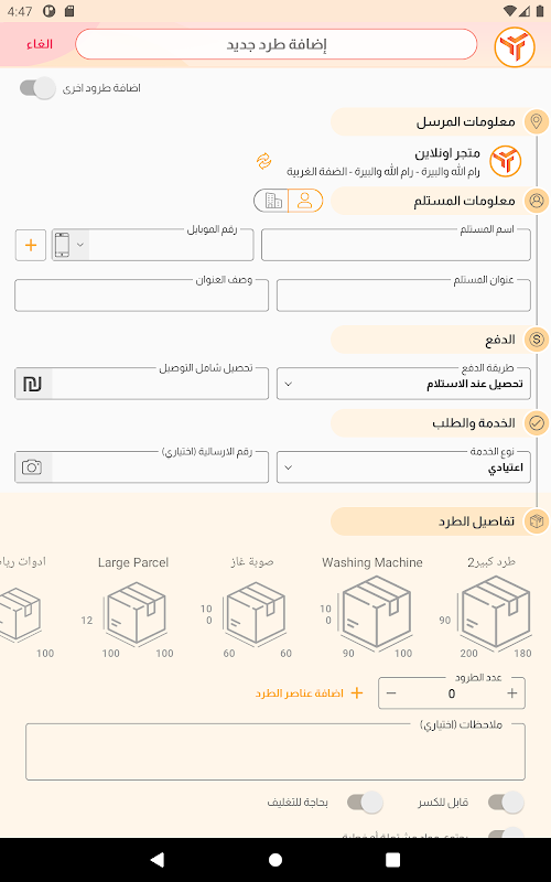 يتيح التطبيق لزبائن الشركة إدارة ومتابعة الطرود الخاصة بهم من لحظة اضافتها على النظام ولغاية تسليمها، بالإضافة لإدارة ومتابعة التحصيلات المالية وحالاتها لتسهيل متابعتها مع الشركة.