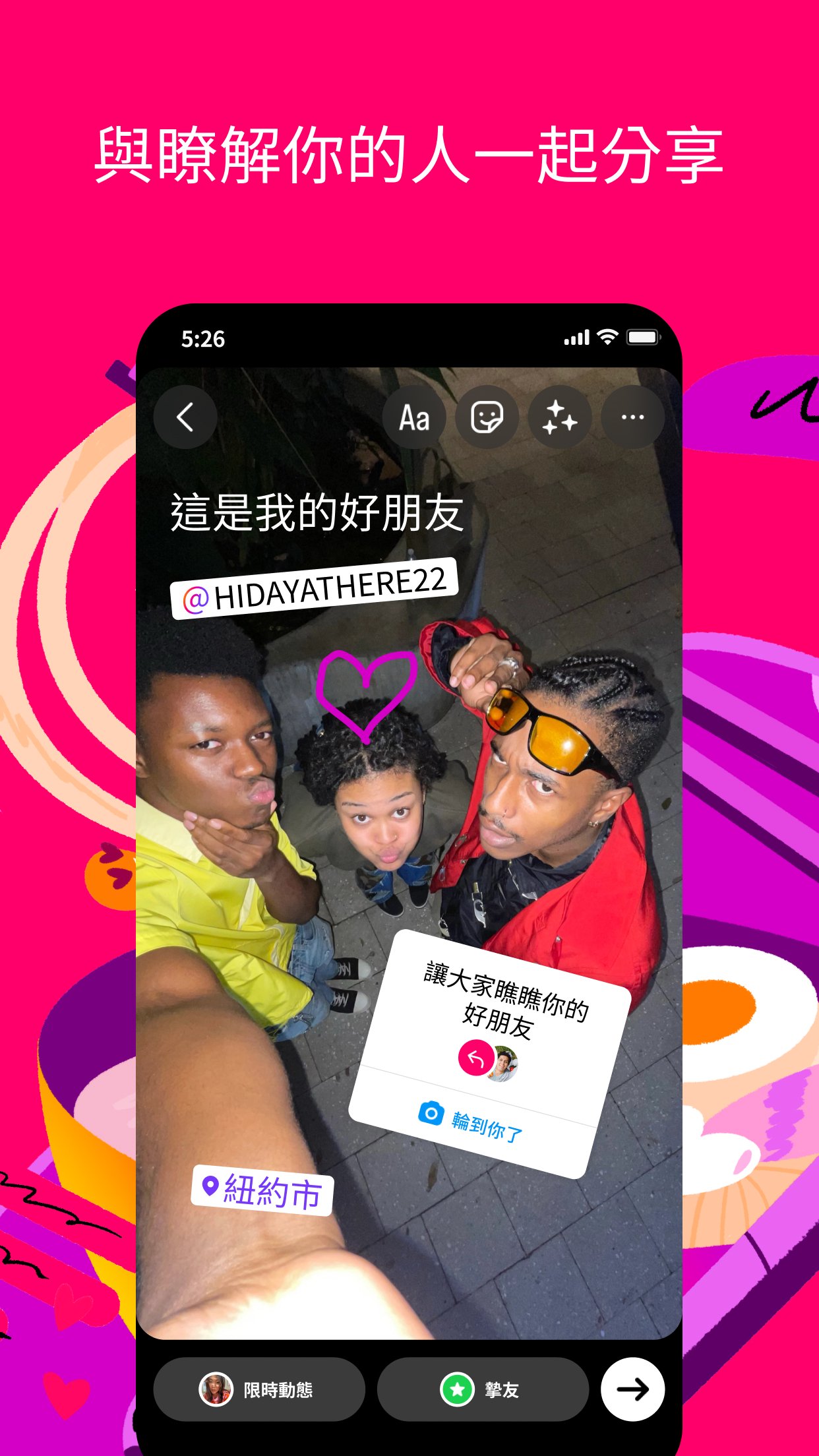 故事功能讓你能夠輕鬆分享日常生活中的時刻或帖子,通過文字、音樂、貼紙和GIF圖像來展現你的故事。
