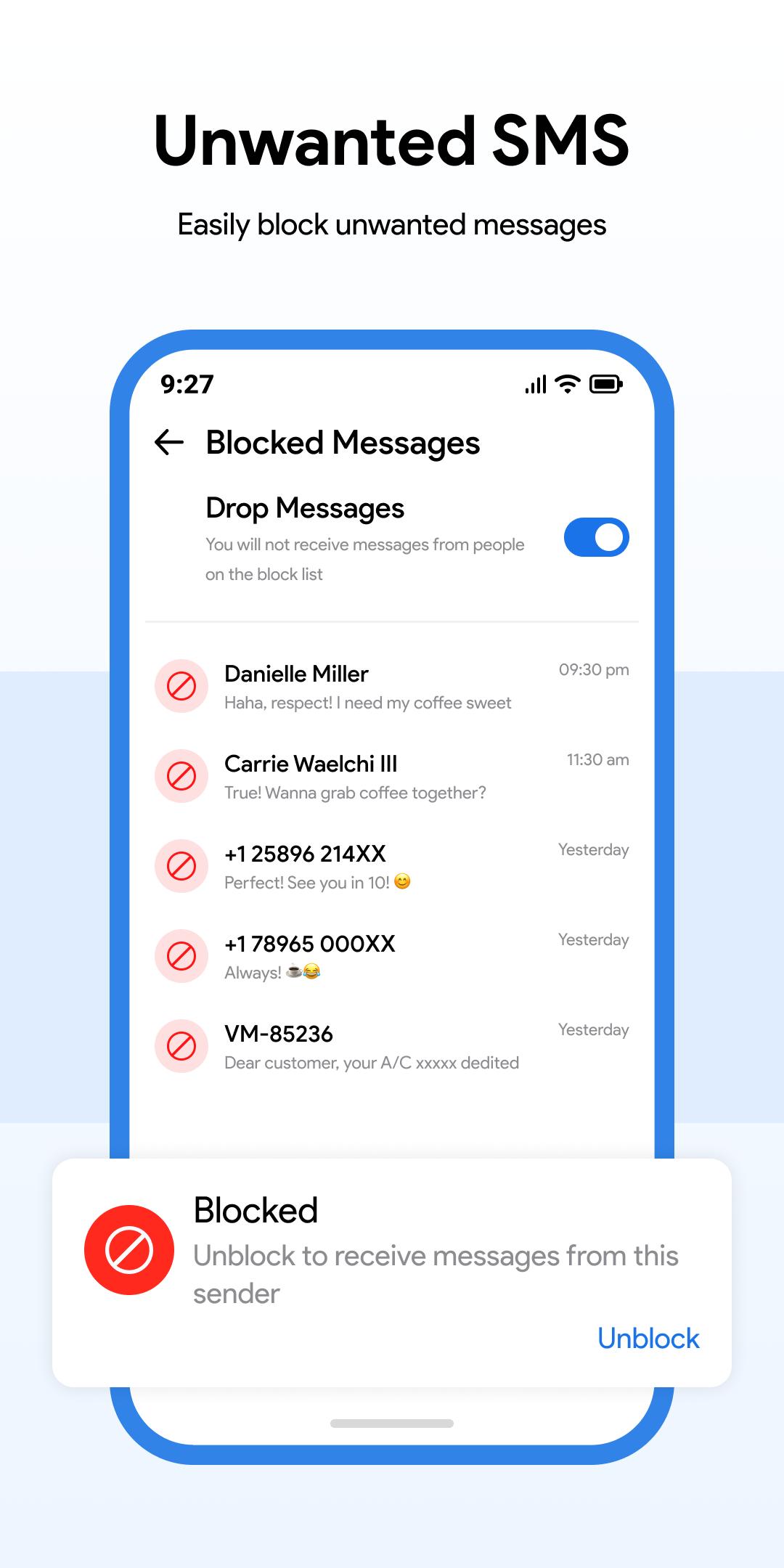 使用內建簡訊攔截器攔截不需要的簡訊。只需將號碼加入黑名單,即可享受垃圾簡訊收件匣 🚫📵
