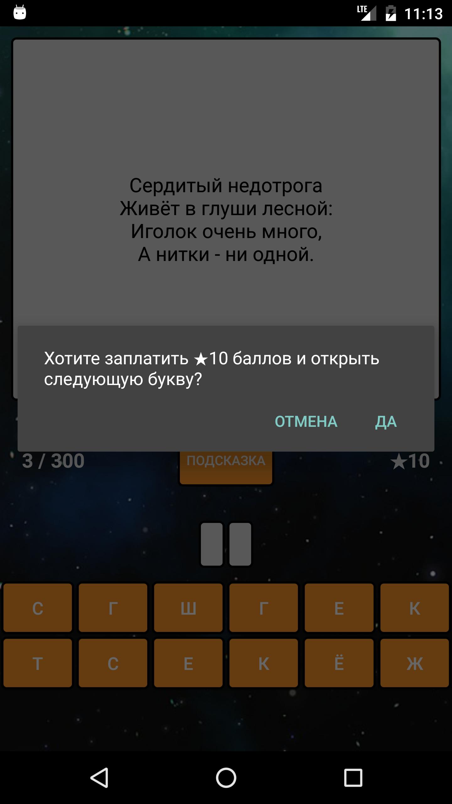 - Если не можешь догадаться - жми "Подсказка", за 10 баллов можно открыть одну букву!