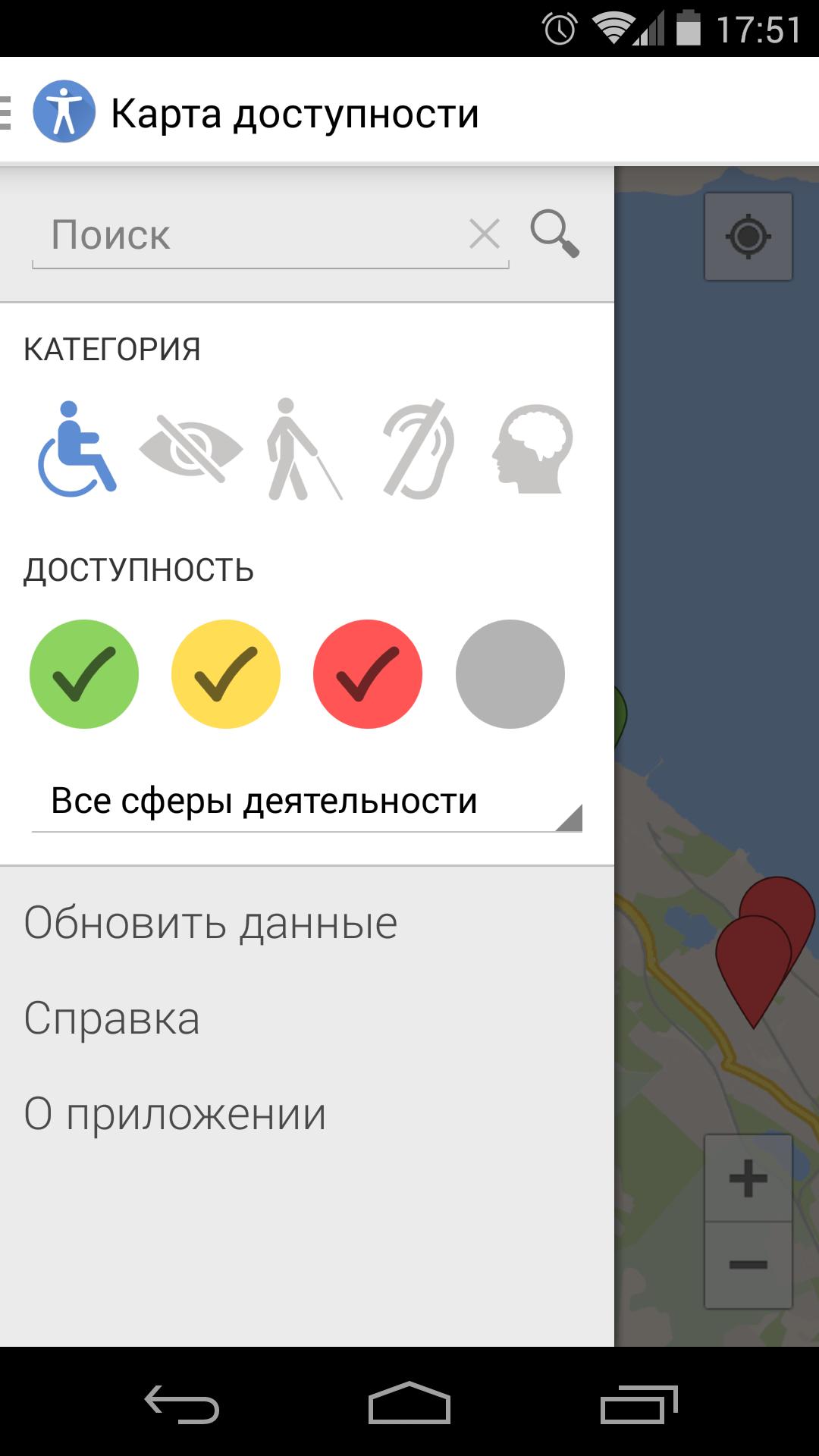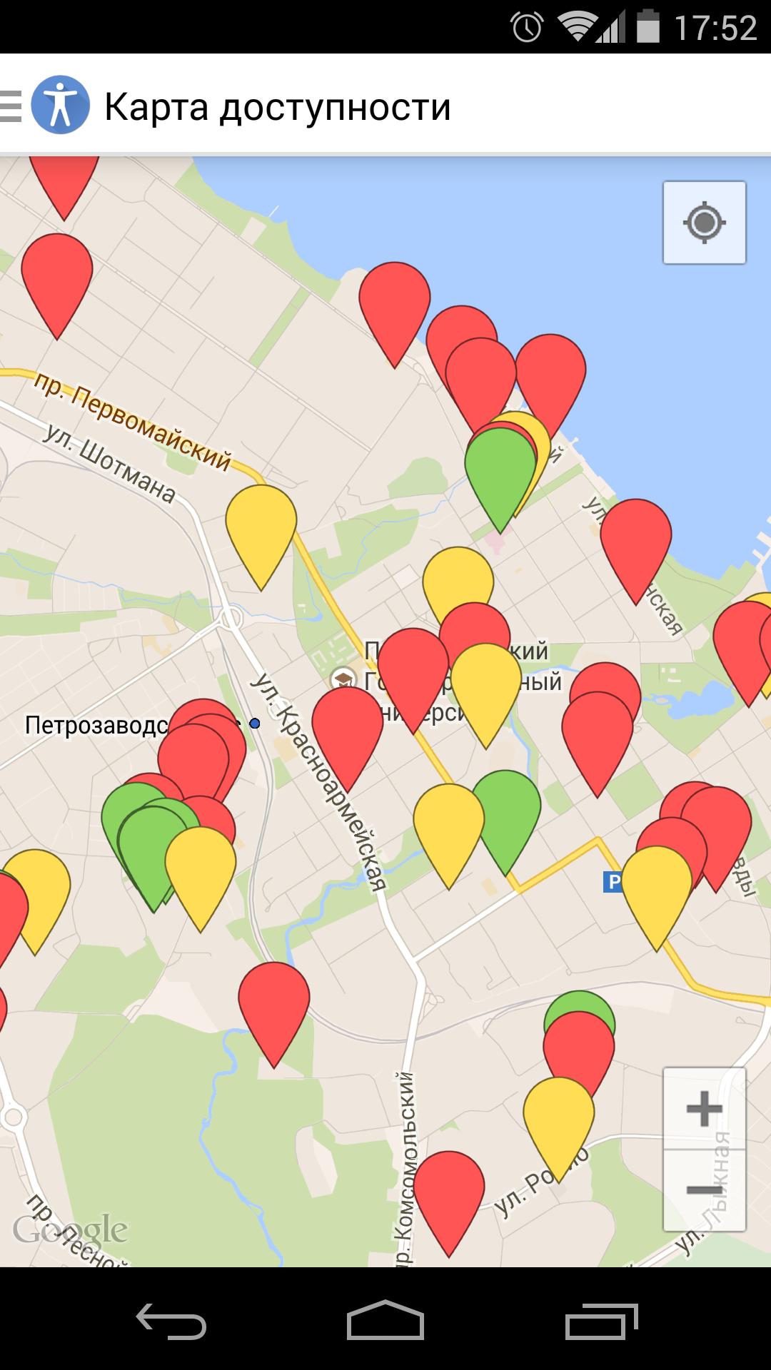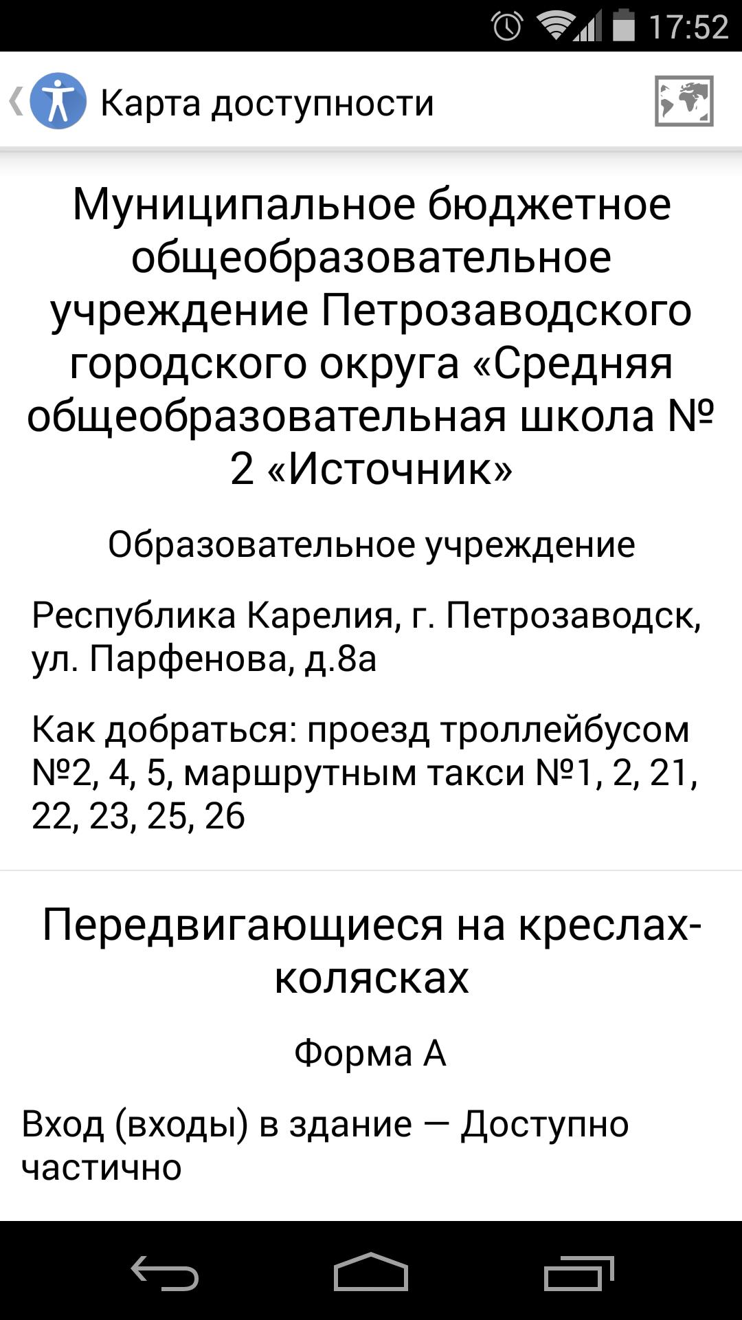 Карта доступности представляет доступ к информации об объектах социальной инфраструктуры с сервиса "Доступная среда" http://ds-karelia.opti-soft.ru/ Каждый объект представлен в виде названия, описания, способов доступа к объекту, информация о доступности объекта в соответствии с категорией ограниченных возможностей. Приложение поддерживает поиск и фильтрацию объектов по категории ограниченных возможностей, по уровню доступности и по категории объекта.