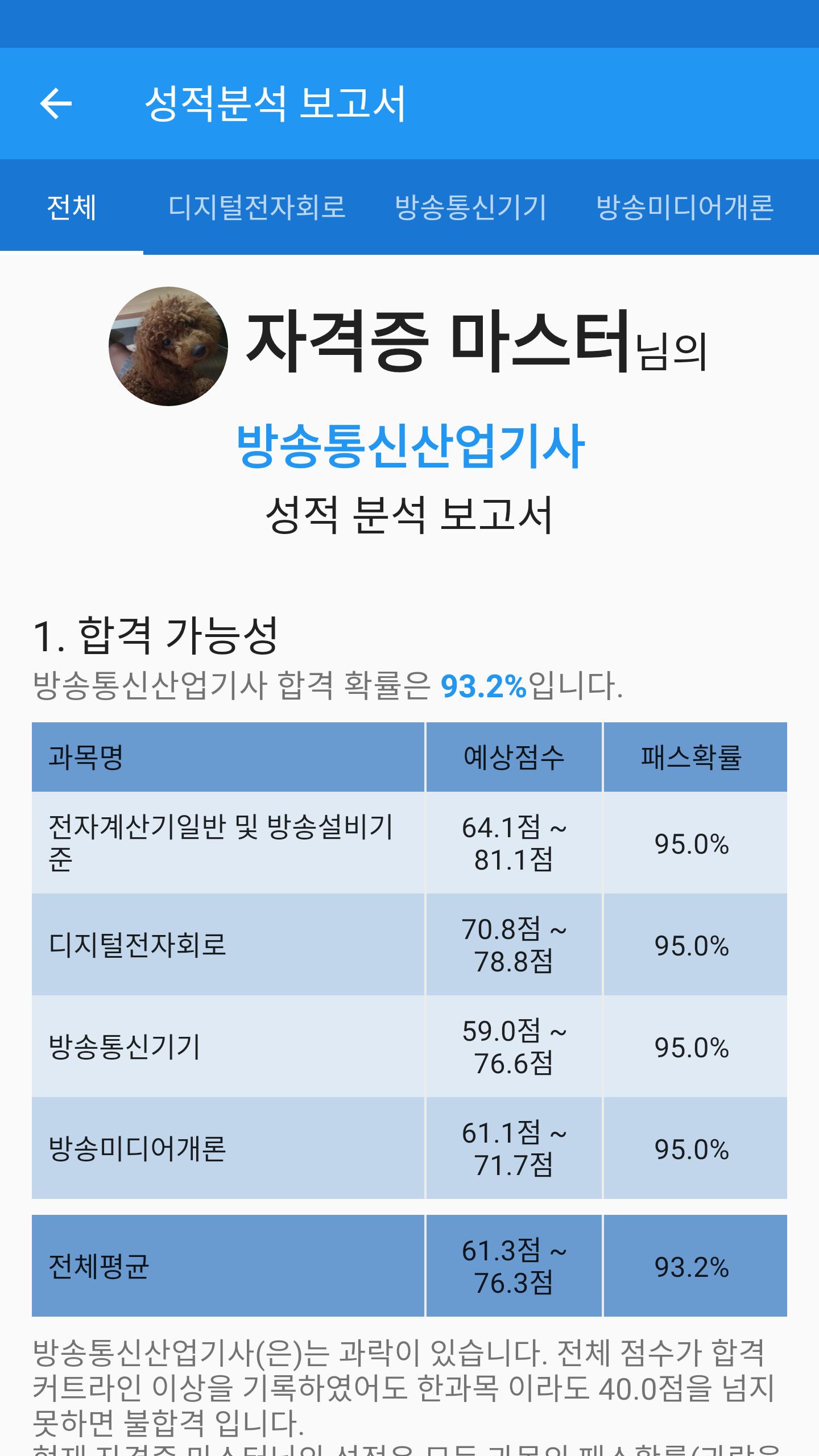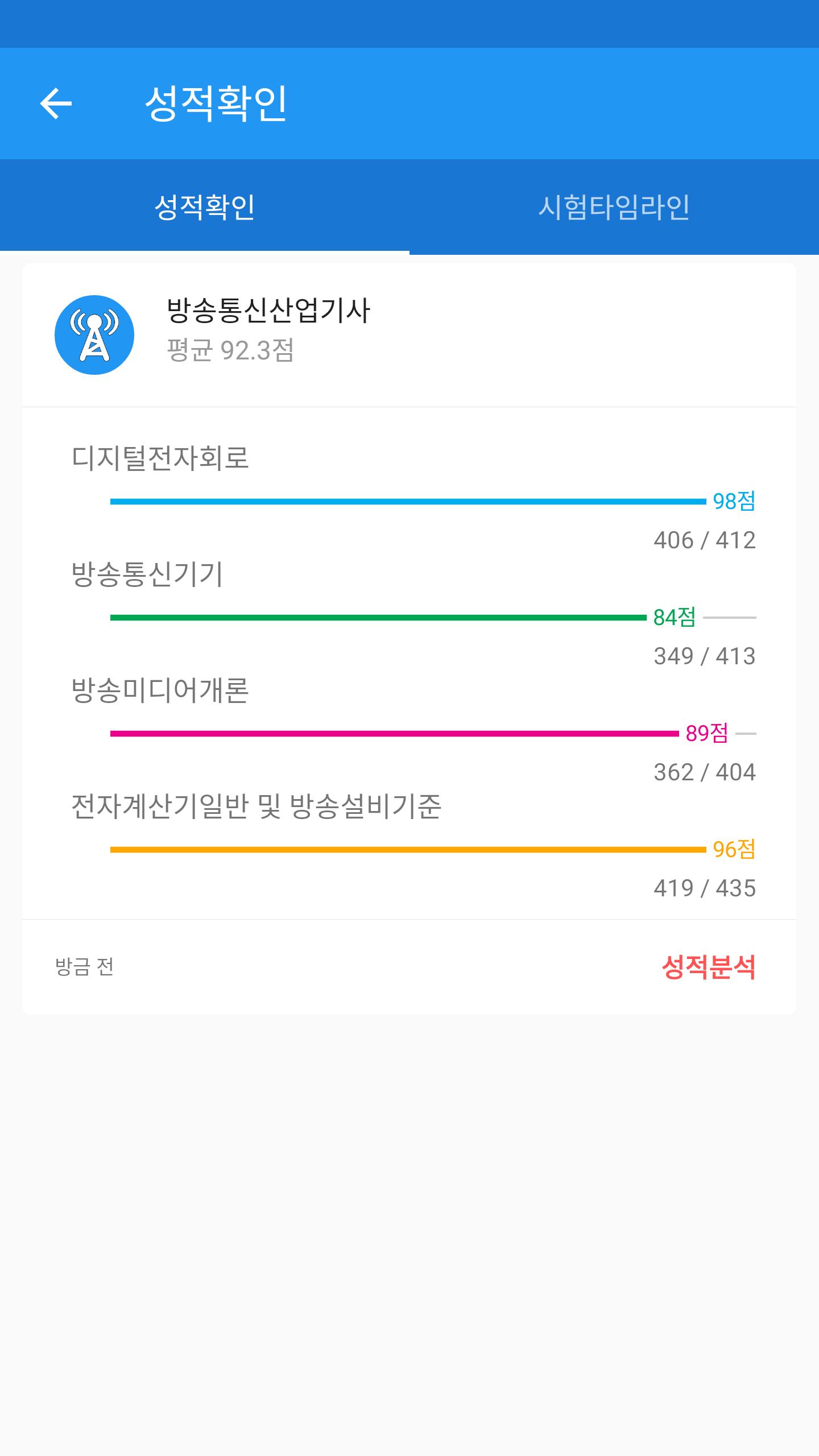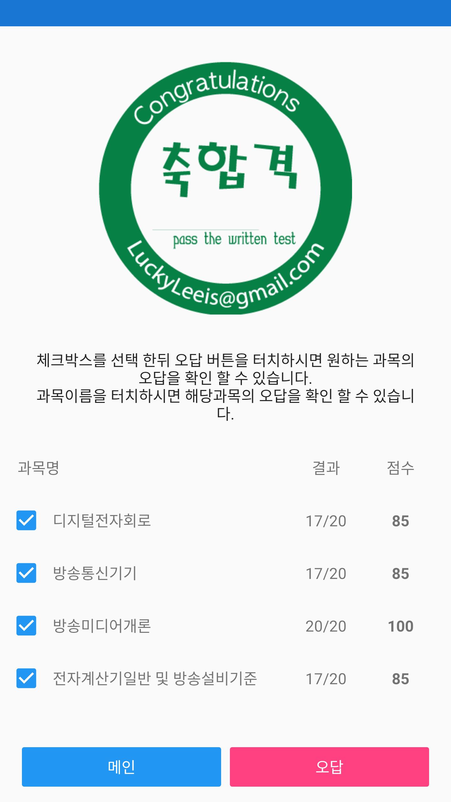성적확인 - 각 과목별 성적 및 그동안 풀어본 기출문제와 모의고사, 문제풀기의 성적을 볼 수 있습니다.