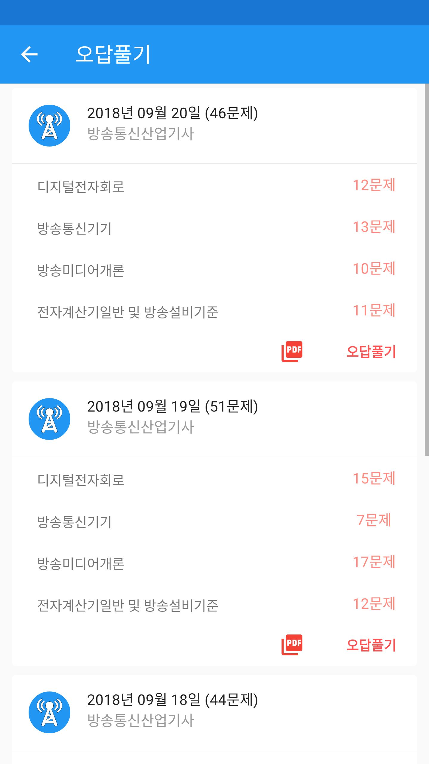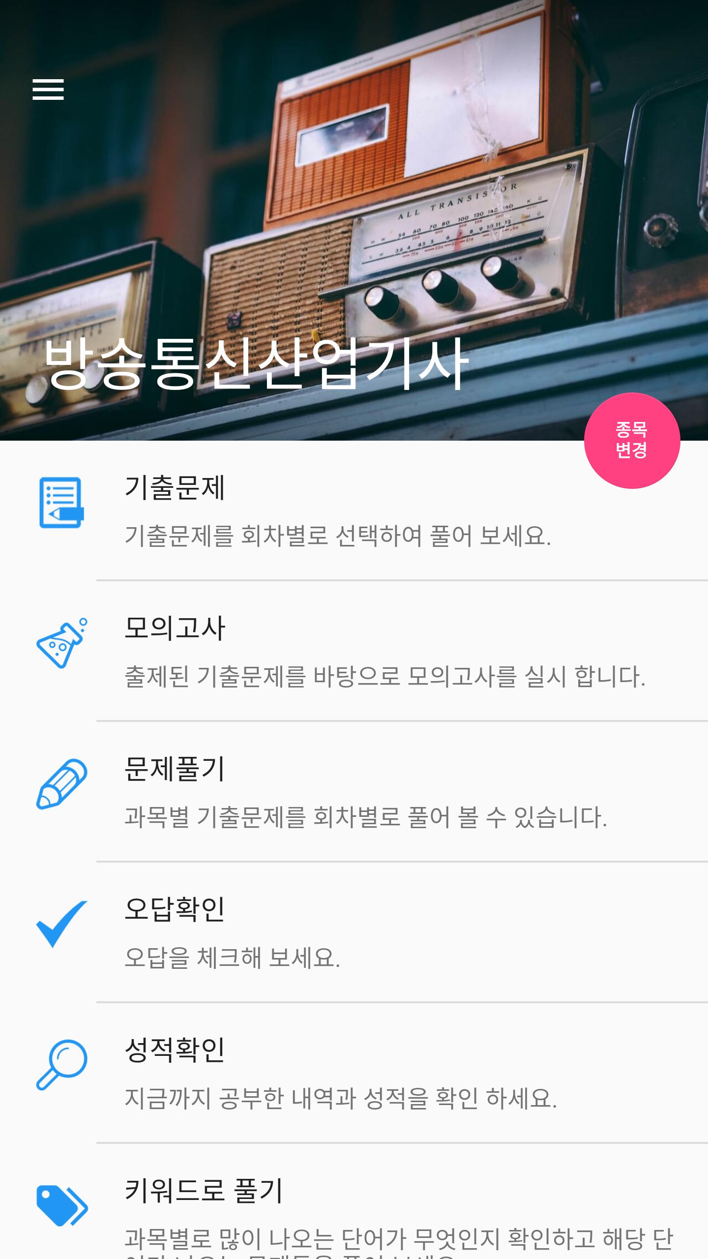 방송통신산업기사 공부를 위한 앱 입니다. 디지털전자회로, 방송통신기기, 전자계산기일반 및 방송설비기준등 과목별로 공부 해 보세요.