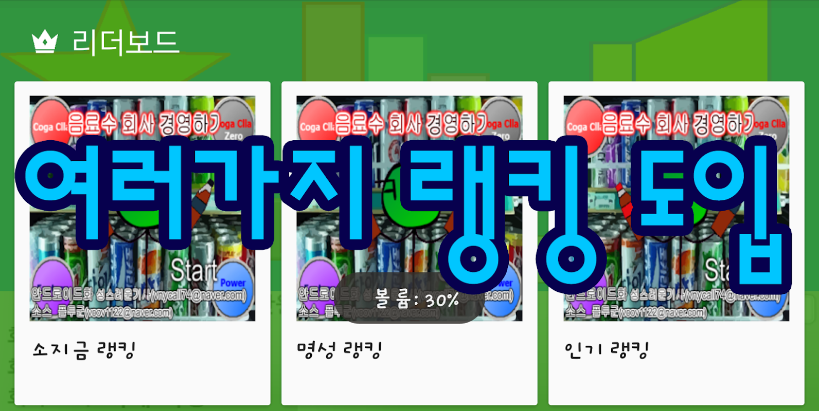 설정에서 소리를 ON / OFF 하며 자신의 순위와 업적을 보시거나 파산과 이벤트기능을 이용하실 수 있습니다.