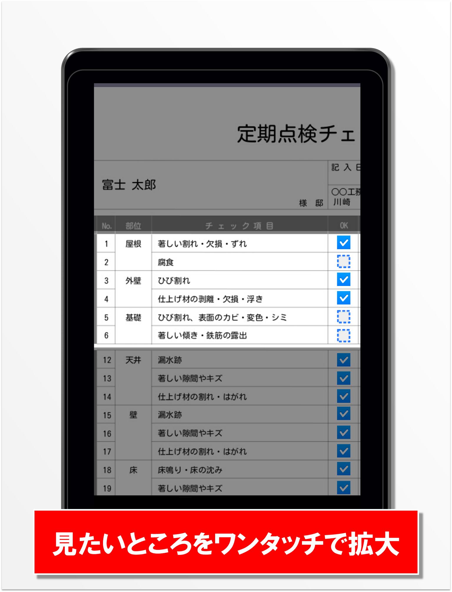 スマートデバイス上で、Smart帳票に手書きやチェック、テキストを入力したり、写真を貼りつけたりできます。