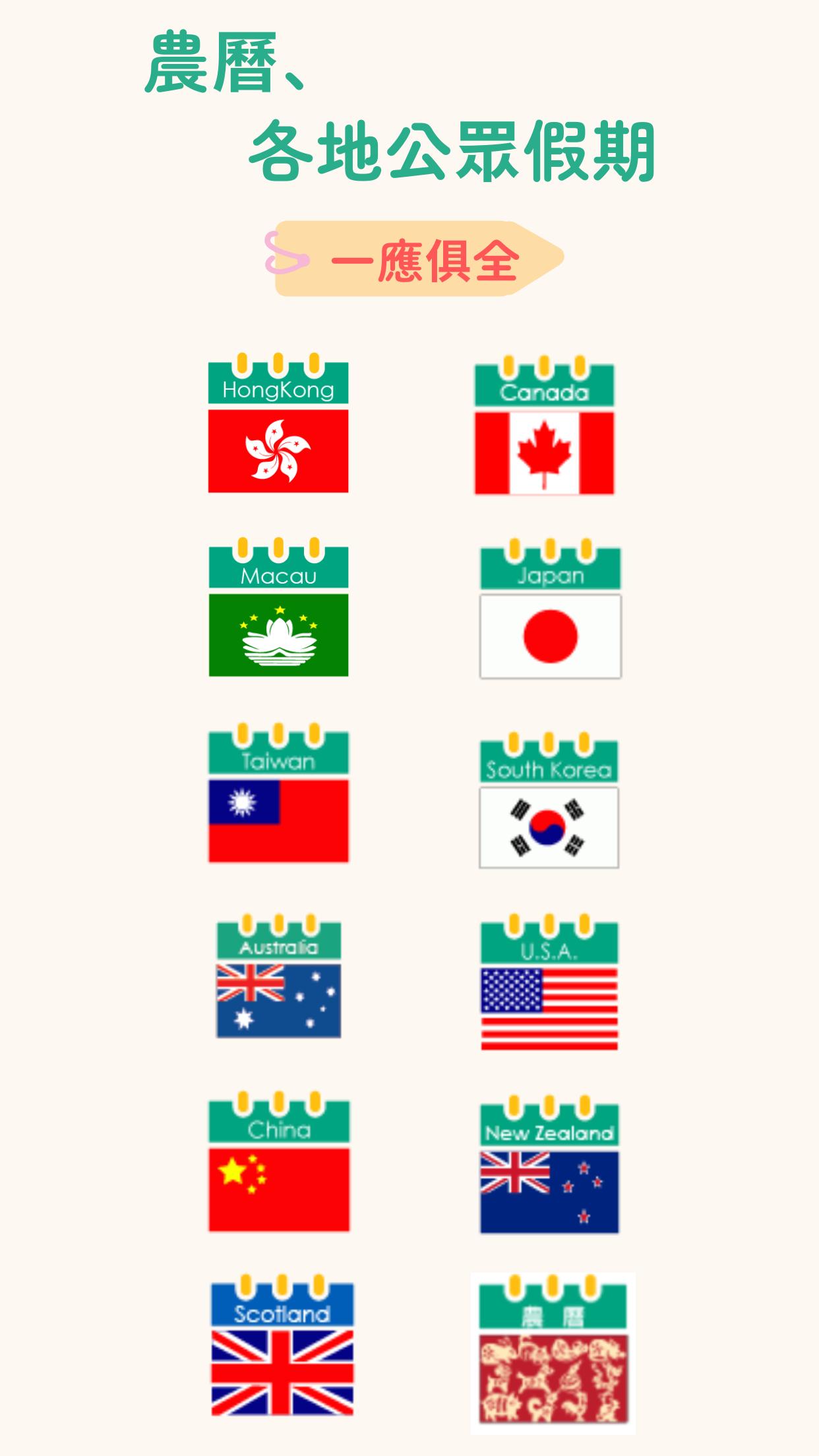 - مختلف جگہوں پر پہلے سے بھری ہوئی عوامی تعطیلات اور قمری کیلنڈر کی تاریخیں: تعطیلات پر نظر رکھیں اور آسانی سے منصوبہ بنائیں۔