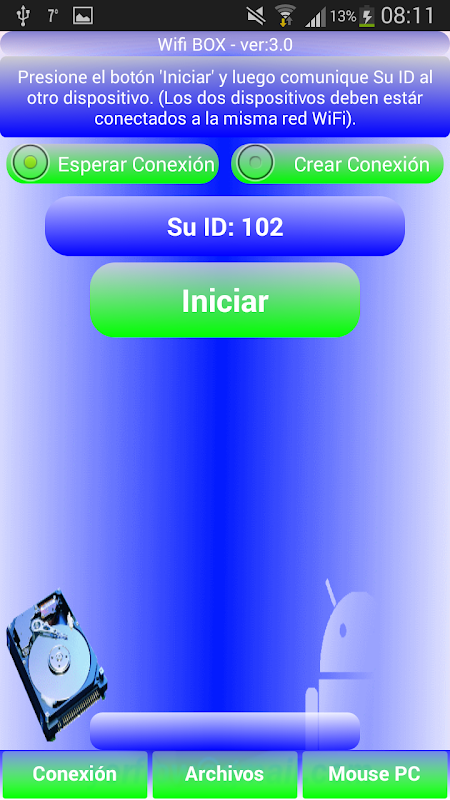 2) un dispositivo con la opción "Esperar Conexión" y luego el botón iniciar y recuerde el número ID que muestra la pantalla.