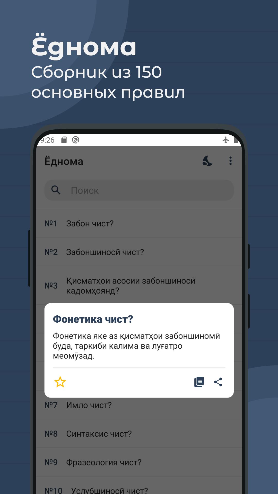 ✅ Yodnoma (savolu ҷavobho az zaboni tojiki) - bộ sưu tập này chứa các quy tắc cơ bản của ngôn ngữ Tajik. Tổng cộng có 150 cuốn, được khuyến nghị cho sinh viên, giáo viên và tất cả những ai muốn học ngữ pháp của ngôn ngữ Tajik.
