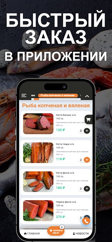 Chào mừng bạn đến với ứng dụng “My Fish” - nhà cung cấp cá và hải sản tươi sống đáng tin cậy của bạn với dịch vụ giao hàng khắp Irkutsk! Chúng tôi cung cấp nhiều loại sản phẩm, bao gồm nhiều loại cá, hải sản và các sản phẩm cá thành phẩm.