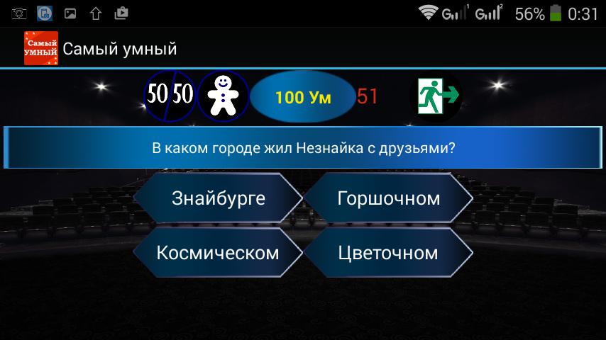 Правила викторины: Ответь правильно на 15 вопросов и стань самым умным. Каждый вопрос содержит 4 варианта ответа, и только один из них правильный. Время на ответ - 60 секунд. Во время игры можно пользоваться двумя подсказками: убрать два неверных варианта или выбрать помощь зала.
