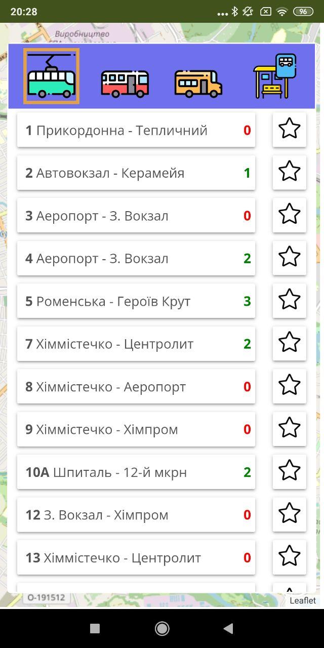 - trong menu chính, chuyển đổi danh sách các tuyến đường và điểm dừng bằng cách nhấp vào hình ảnh có hình ảnh của phương tiện giao thông hoặc điểm dừng tương ứng;