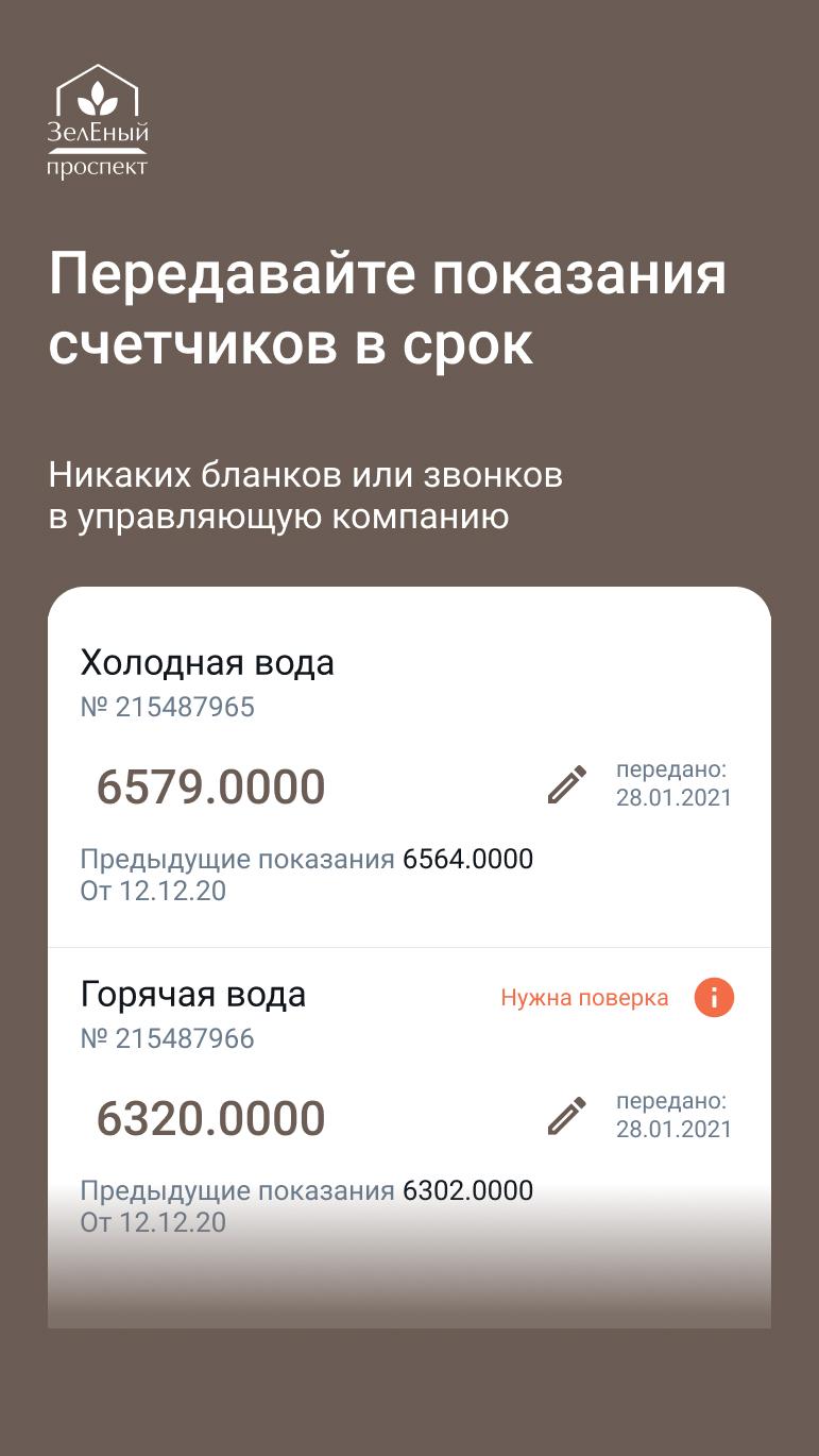 В разделе Счетчики добавили блок с историей показаний и информацией о счетчике. Можно отслеживать расход ресурсов и точно знать, когда выполнить поверку счетчика.