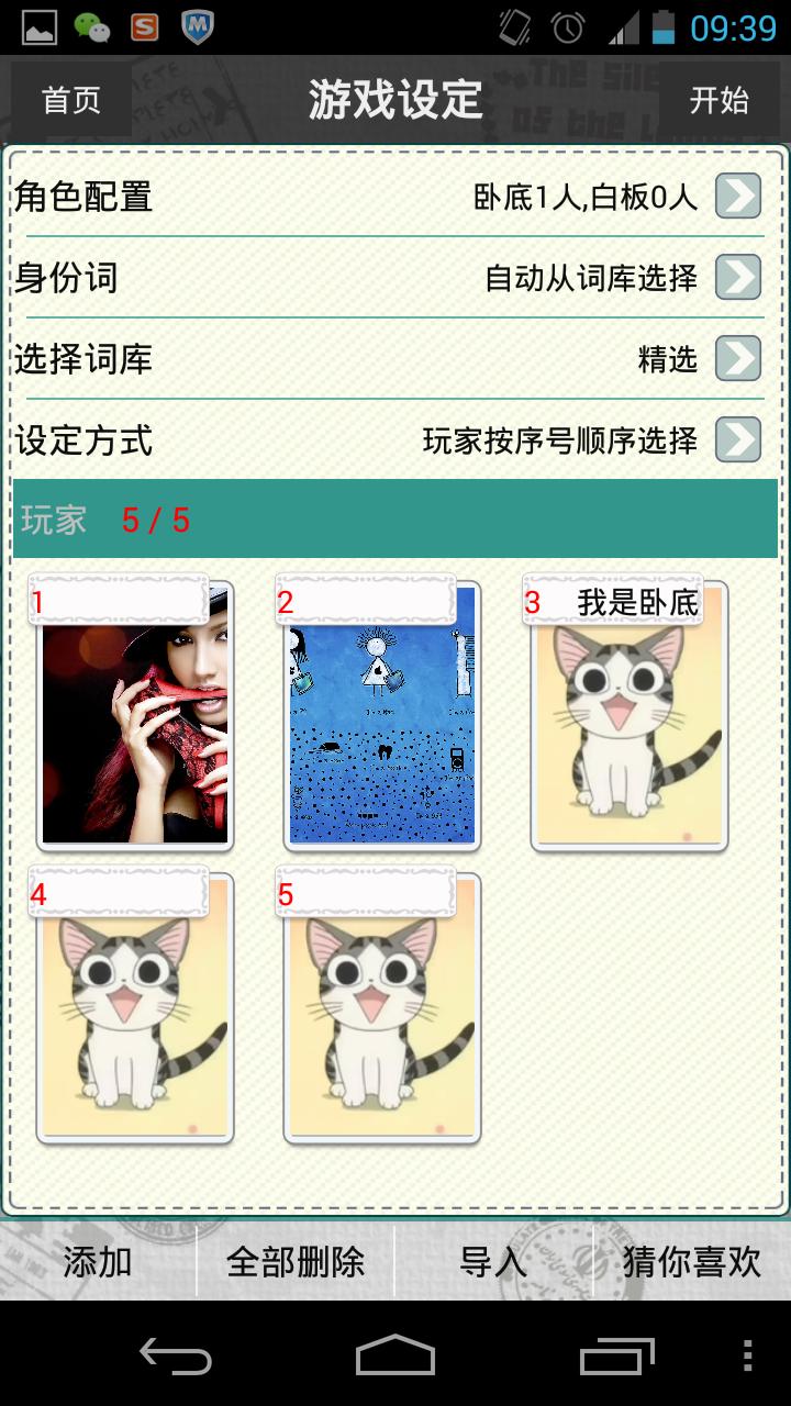 ◆ 玩家分为三种角色:平民、卧底和白板。玩家人数少于6人时没有白板角色。