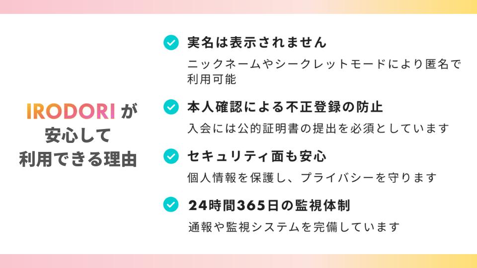 IRODORI là một ứng dụng phù hợp cho phép bạn nghiêm túc tìm kiếm một đối tác quan trọng hiểu được khuyết tật của bạn. Nhờ hệ thống sàng lọc, bạn có thể nghiêm túc tìm kiếm bạn bè và người yêu.