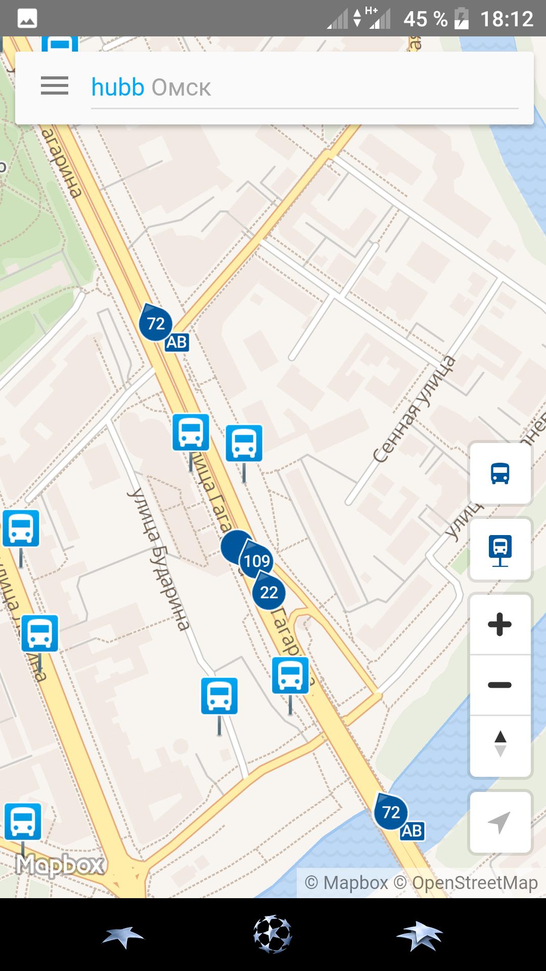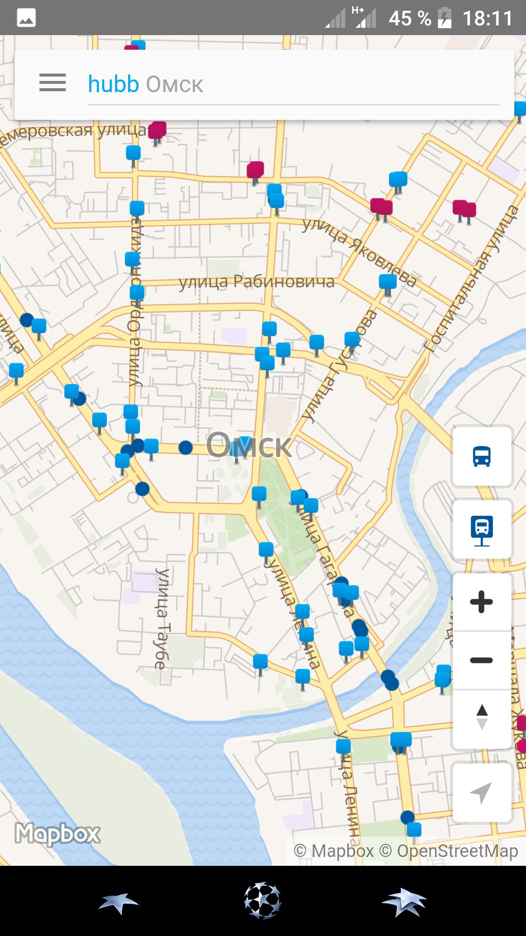 -приложение показывает в режиме реального времени транспорт оборудованный и с функционирующим GPS трекингом в городе Омск.